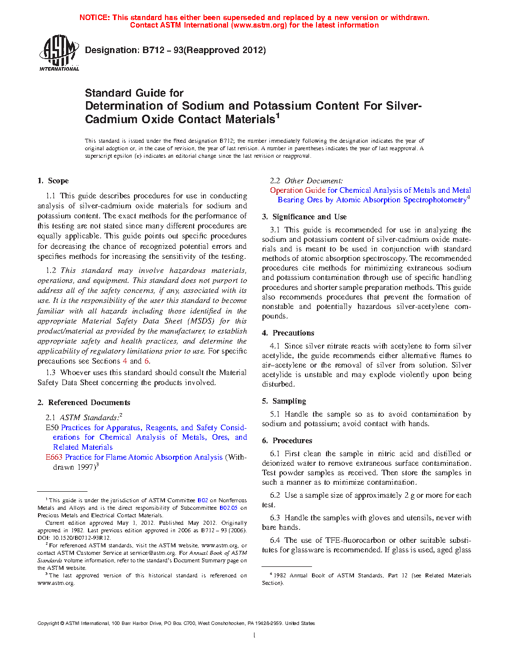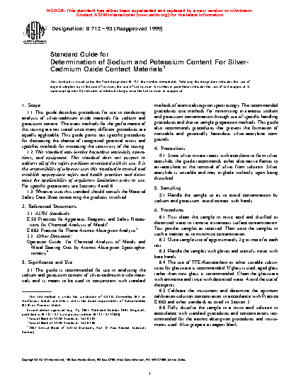 1.1 This guide describes procedures for use in conducting analysis of silver-cadmium oxide materials for sodium and potassium content. The exact methods for the performance of this testing are not stated since many different procedures are equally applicable. This guide points out specific procedures for decreasing the chance of recognized potential errors and specifies methods for increasing the sensitivity of the testing.