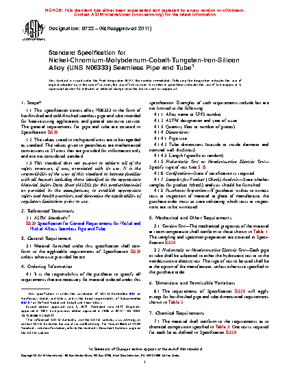 Standard Specification for Nickel-Chromium-Molybdenum-Cobalt-Tungsten-Iron-Silicon Alloy (UNS N06333) Seamless Pipe and Tube