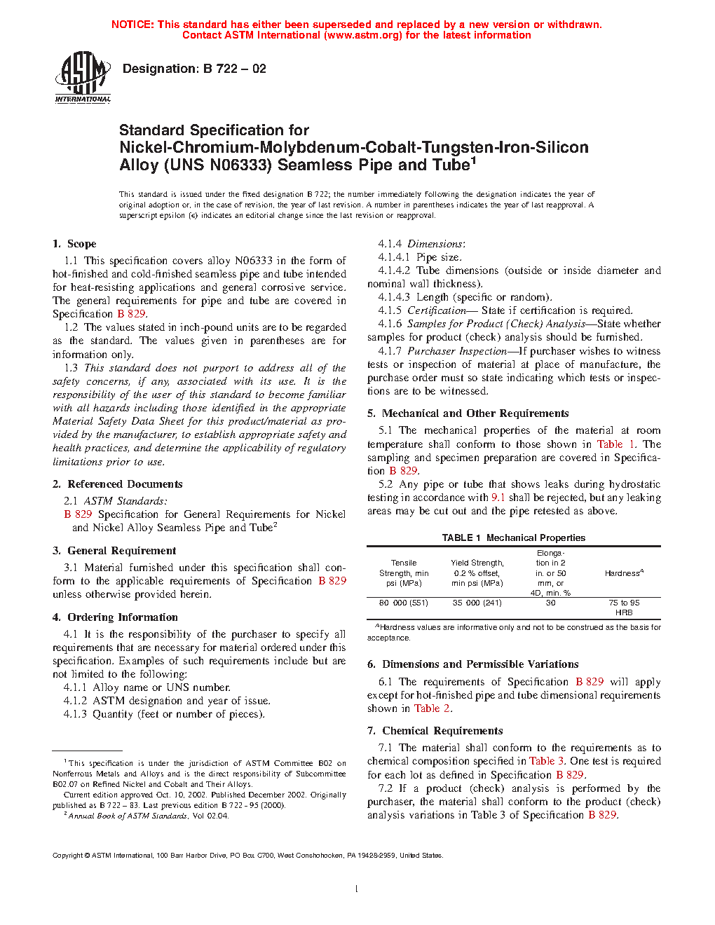 1.1 This specification covers alloy N06333 in the form of hot-finished and cold-finished seamless pipe and tube intended for heat-resisting applications and general corrosive service. The general requirements for pipe and tube are covered in Specification B829.