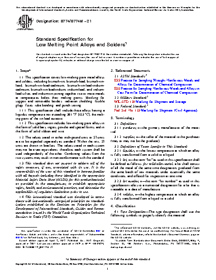 1.1 This specification covers low-melting point metal alloys and solders, including bismuth-tin, bismuth-lead, bismuth-tin-lead, bismuth-tin-lead-cadmium, bismuth-tin-lead-indium-cadmium, bismuth-tin-lead-indium, indium-lead, and indium-lead-silver, and indium-tin joining together two or more metals at temperatures below their melting points; blocking for support and removable borders; radiation shielding; fusible plugs; fuses; tube bending; and punch setting.