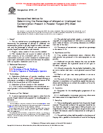 1.1 This test method covers a metallographic procedure for determining the percentage of alloyed or unalloyed iron contamination present in powder forged low-alloy steel materials and the percentage of alloyed iron contamination in powder forged iron and carbon steel materials.