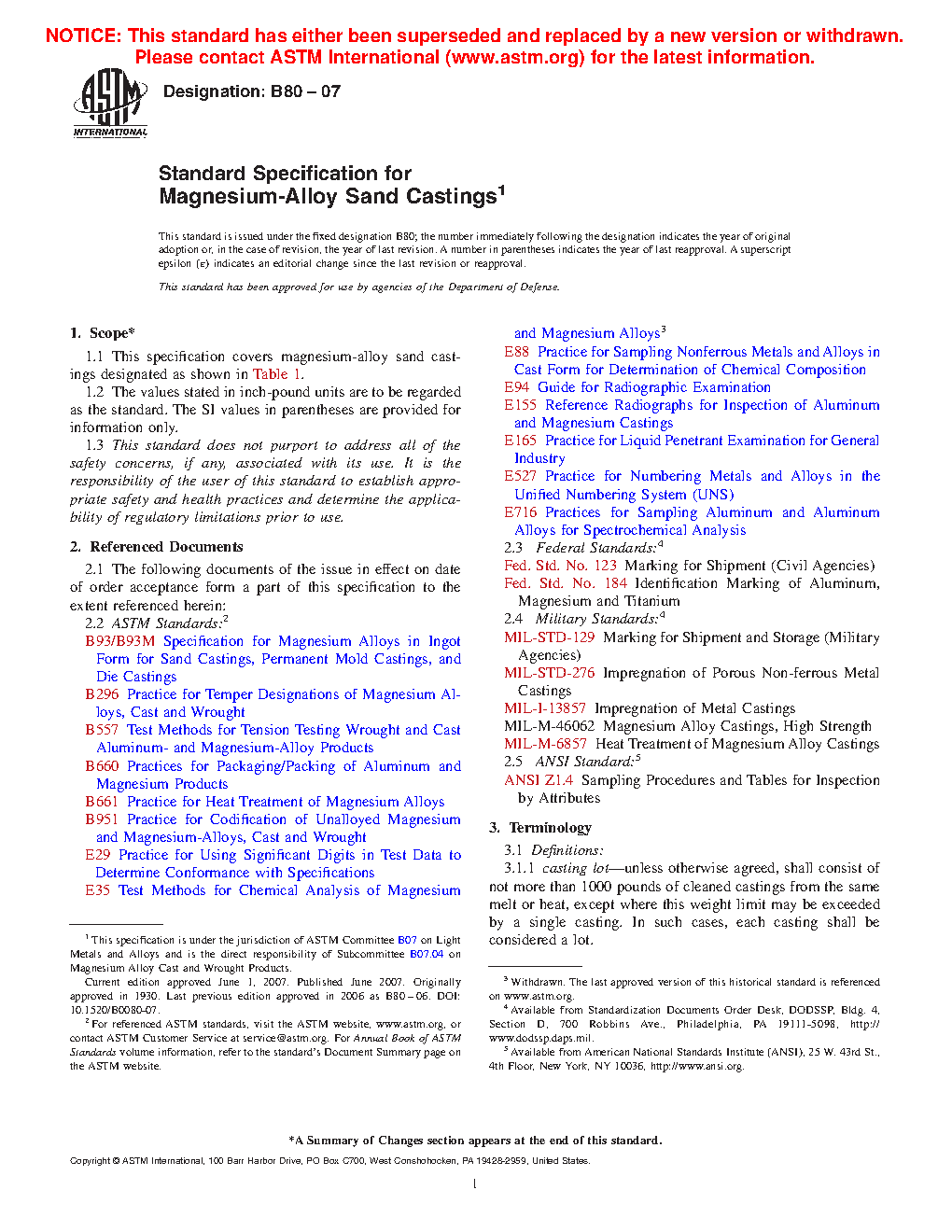 1.1 This specification covers magnesium-alloy sand castings designated as shown in Table 1.