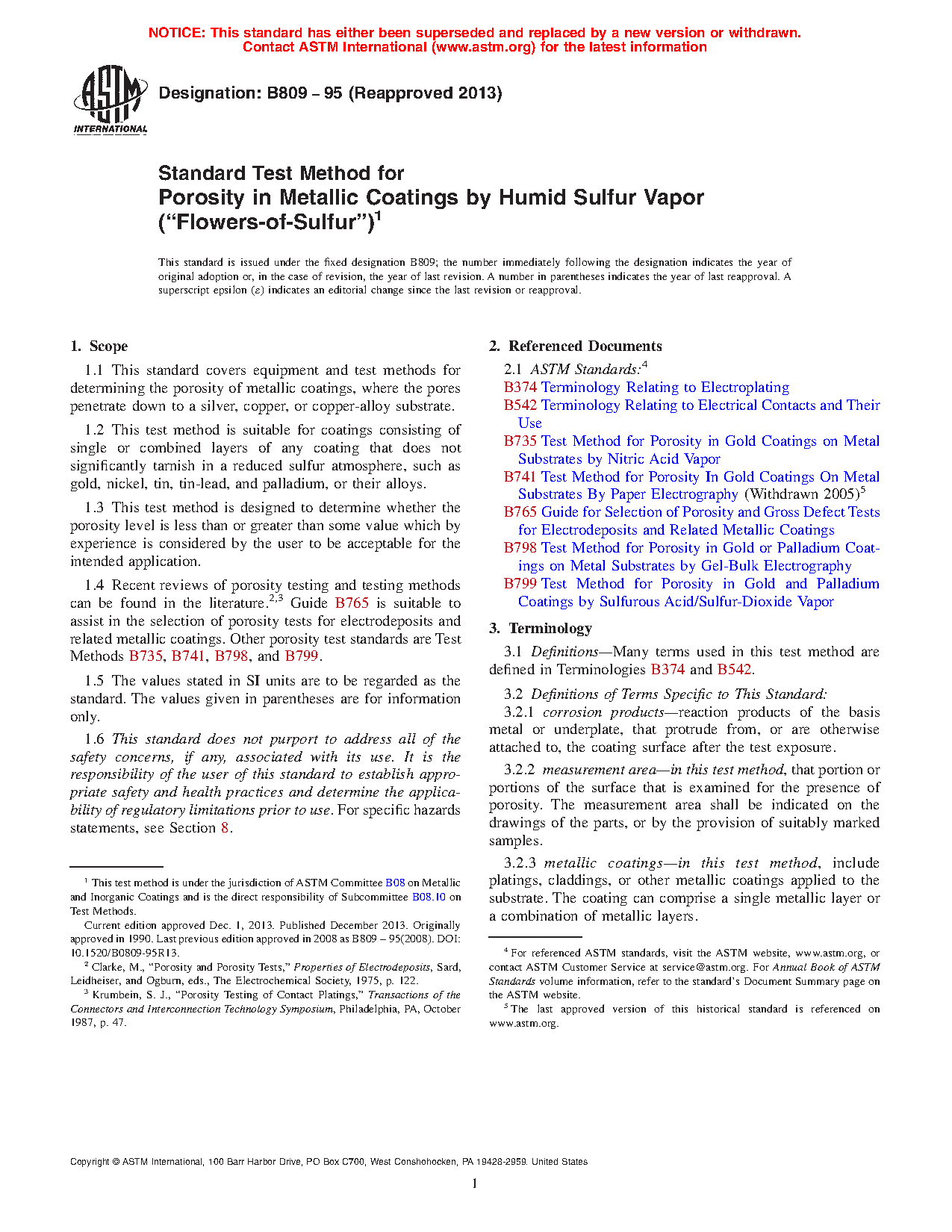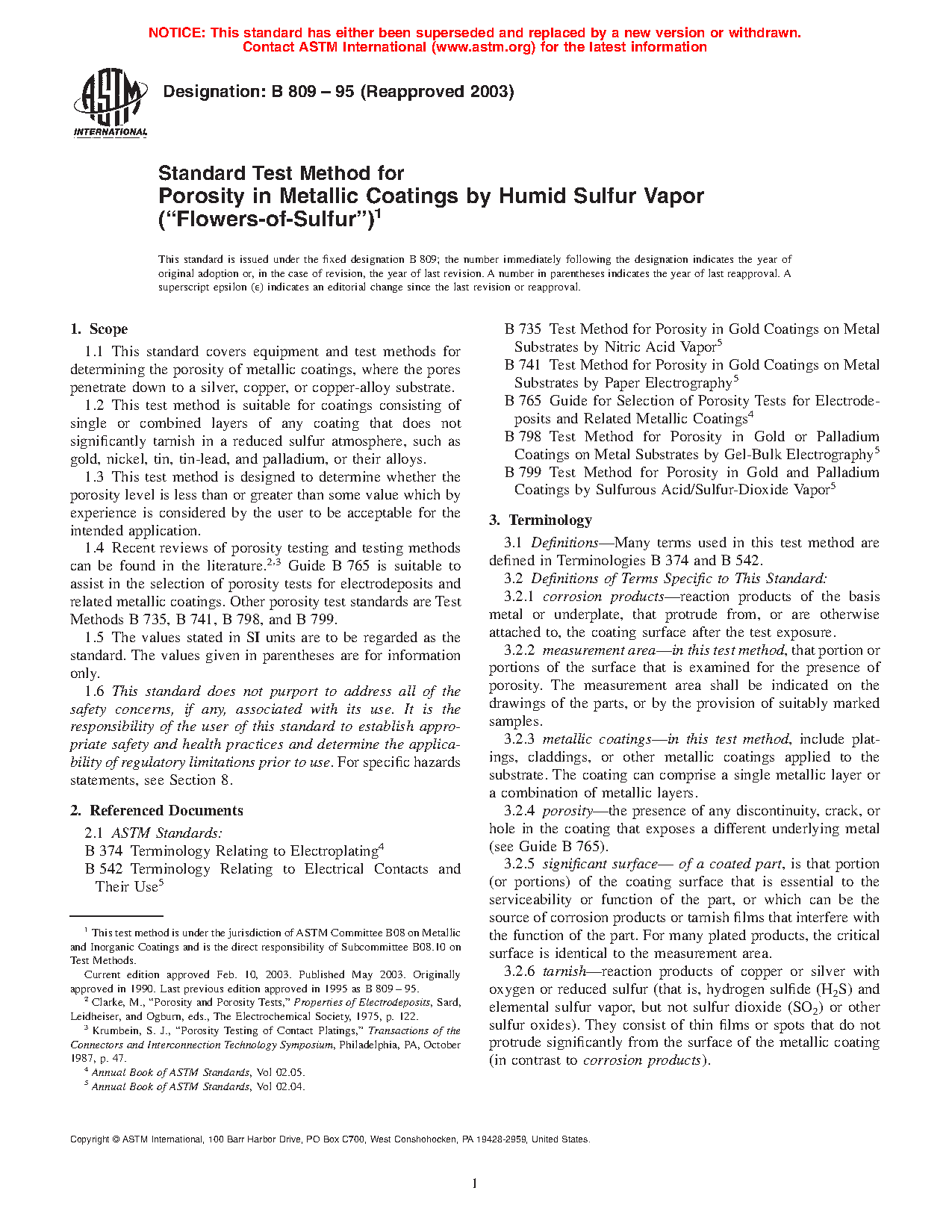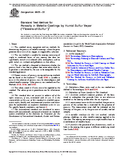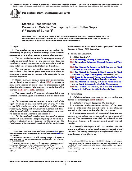 1.1 This standard covers equipment and test methods for determining the porosity of metallic coatings, where the pores penetrate down to a silver, copper, or copper-alloy substrate.