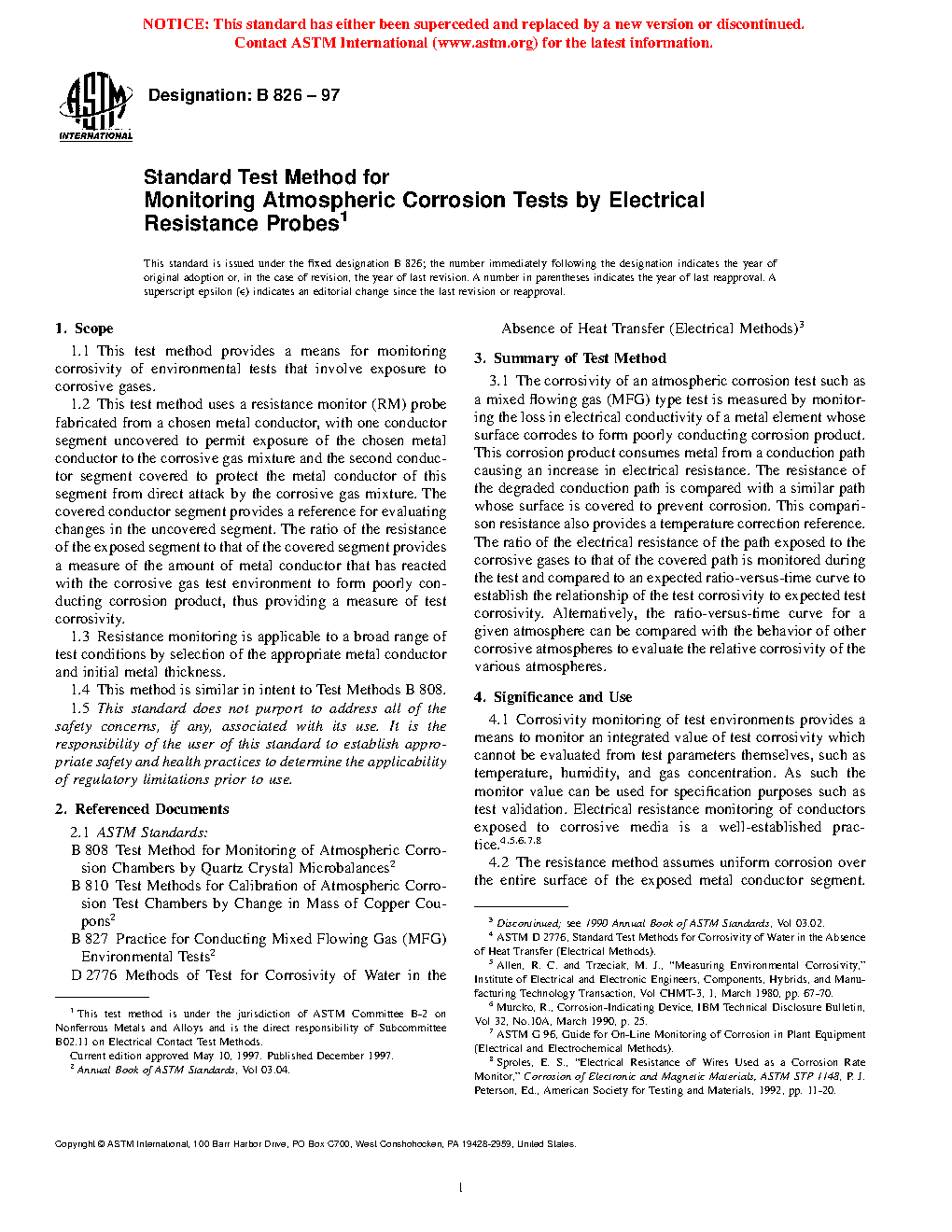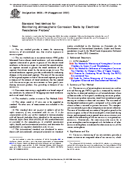 1.2 This test method uses a resistance monitor (RM) probe fabricated from a chosen metal conductor, with one conductor segment uncovered to permit exposure of the chosen metal conductor to the corrosive gas mixture and the second conductor segment covered to protect the metal conductor of this segment from direct attack by the corrosive gas mixture. The covered conductor segment provides a reference for evaluating changes in the uncovered segment. The ratio of the resistance of the exposed segment to that of the covered segment provides a measure of the amount of metal conductor that has reacted with the corrosive gas test environment to form poorly conducting corrosion product, thus providing a measure of test corrosivity.