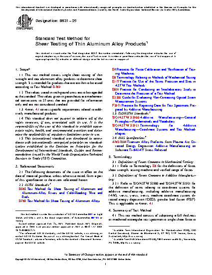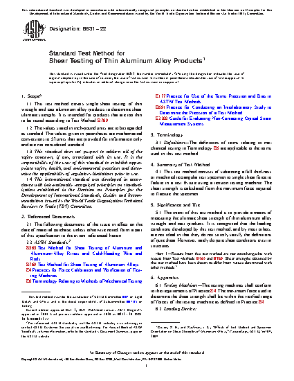 1.1 This test method covers single shear testing of thin wrought and cast aluminum alloy products to determine shear ultimate strengths. It is intended for products that are too thin to be tested according to Test Method B769.