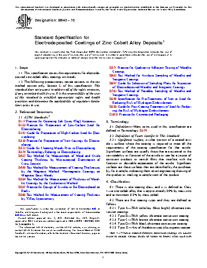 This specification covers the requirements for electrodeposited zinc cobalt alloy coatings on metals. The coating class is Class 1 and five coating types are Type a, Type b, Type c, Type d, and Type e. The metal to be plated shall be subjected to such cleaning, pickling, and electroplating procedures. Coating requirements include: substrate, nature of coating, appearance, thickness, adhesion, corrosion resistance, and pre- and post-coating treatments of iron and steel for reducing the risk of hydrogen embrittlement. Adhesion, porosity, corrosion resistance, or appearance tests shall be made.