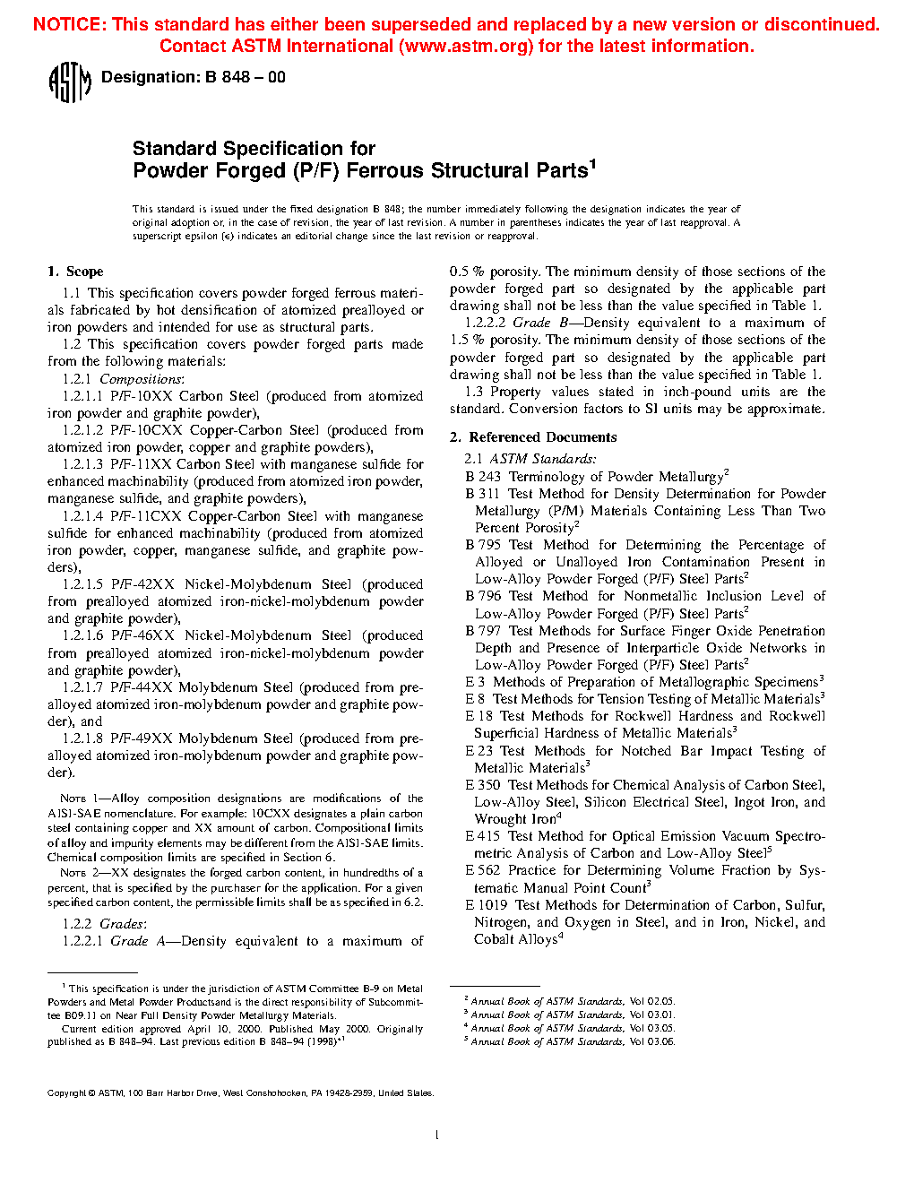 1.2.2.2Grade B —Density equivalent to a maximum of 1.5 % porosity. The minimum density of those sections of the powder forged part so designated by the applicable part drawing shall not be less than the value specified in .