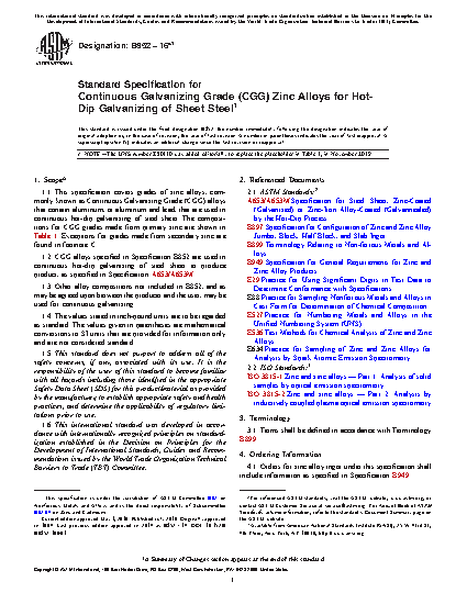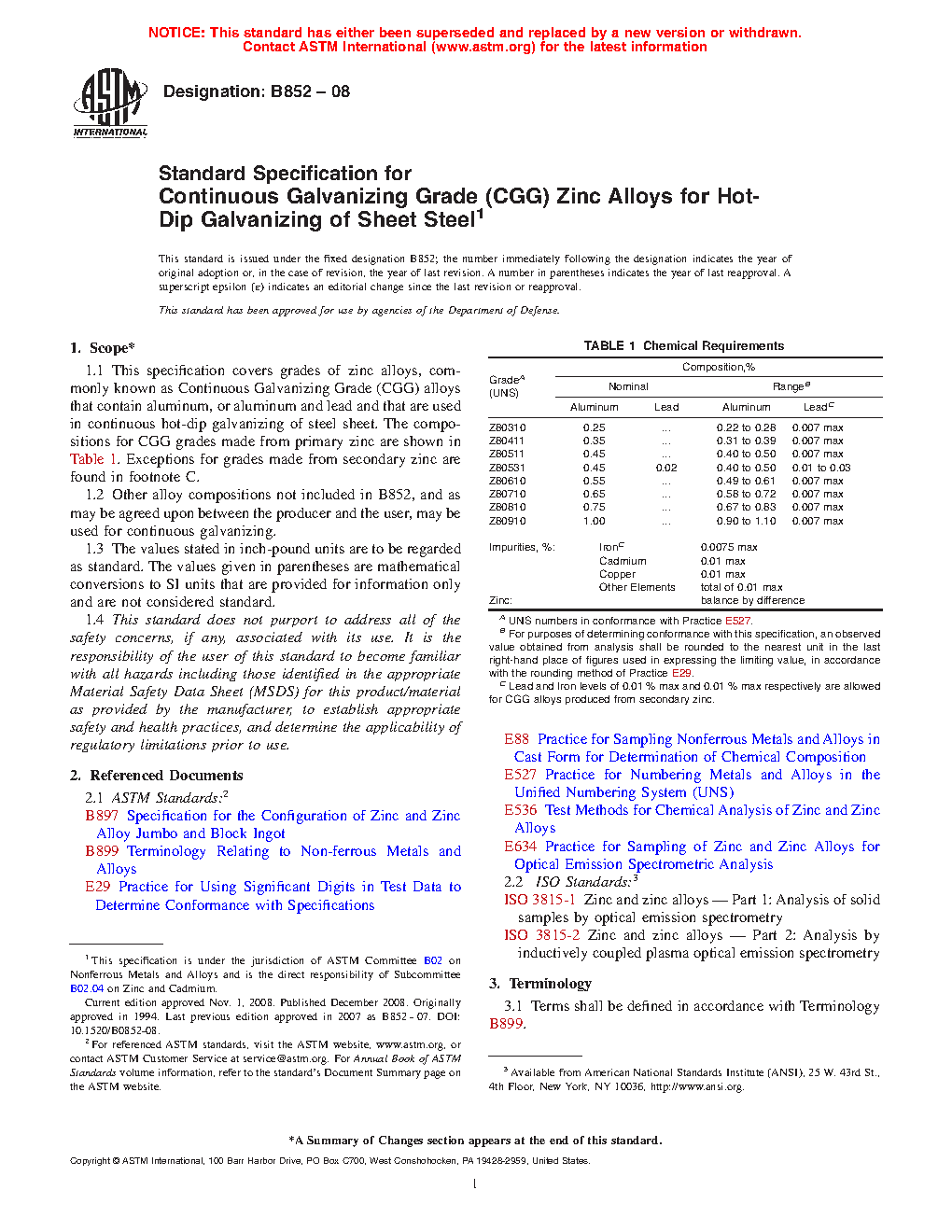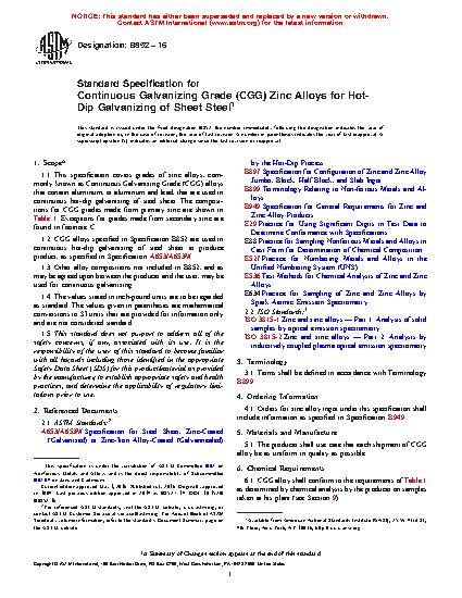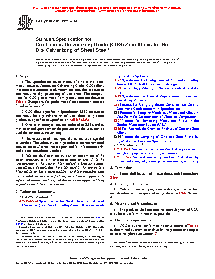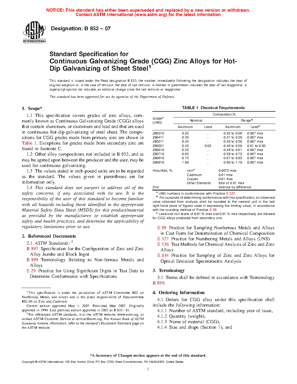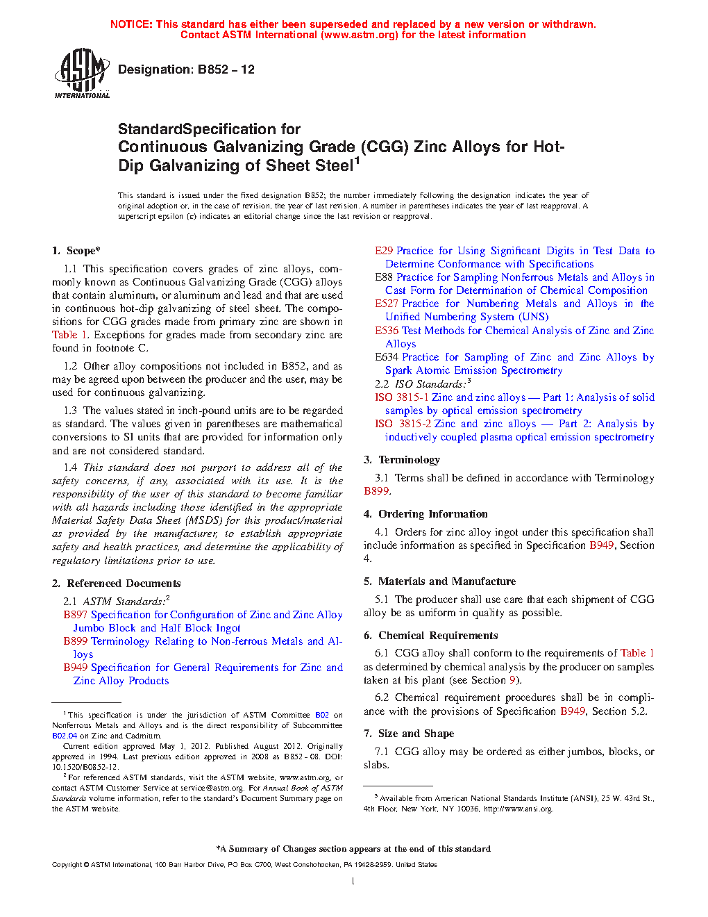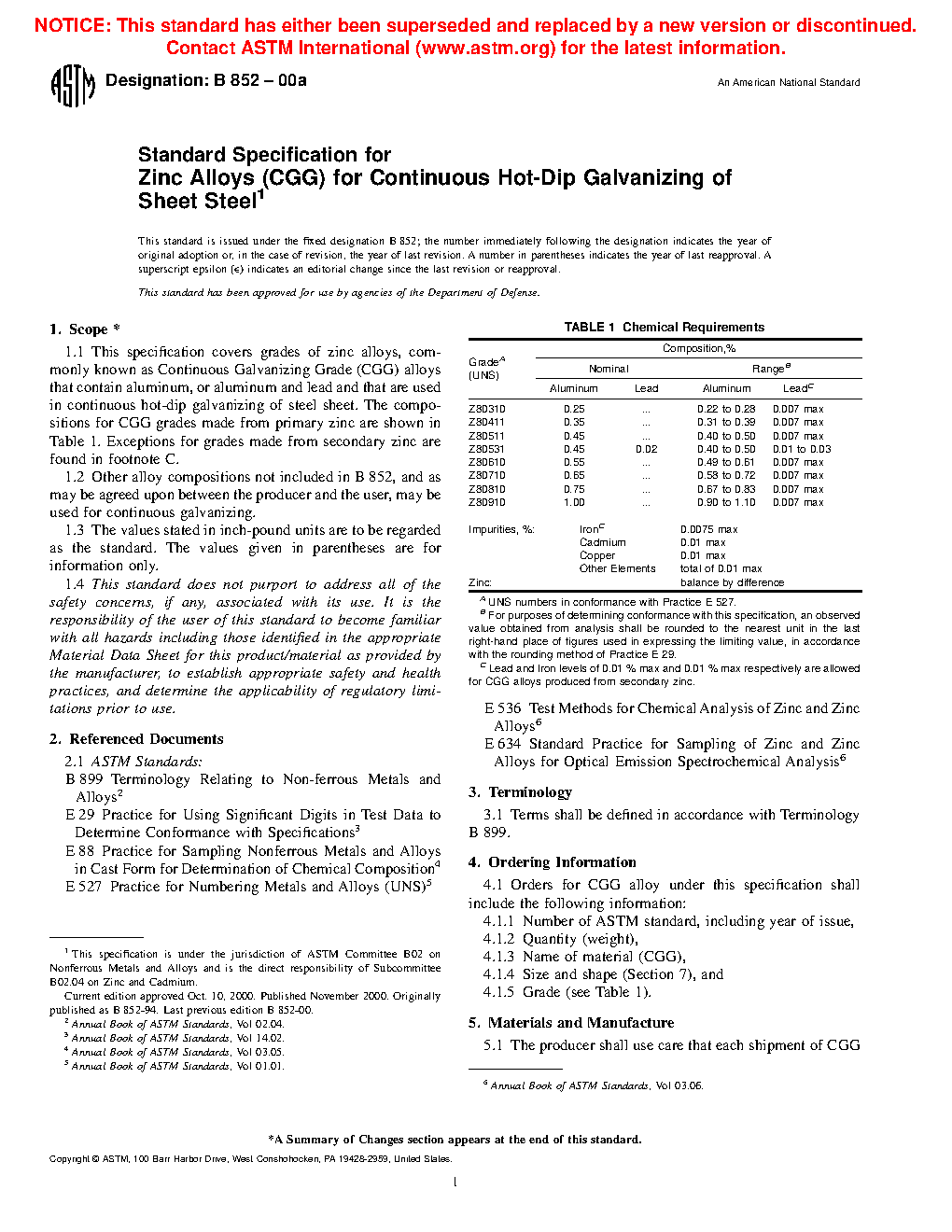 1.2 CGG alloys specified in Specification B852 are used in continuous hot-dip galvanizing of steel sheet to produce product, as specified in Specification A653/A653M.