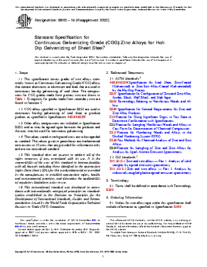 1.1 This specification covers grades of zinc alloys, commonly known as Continuous Galvanizing Grade (CGG) alloys that contain aluminum, or aluminum and lead, that are used in continuous hot-dip galvanizing of steel sheet. The compositions for CGG grades made from primary zinc are shown in Table 1. Exceptions for grades made from secondary zinc are found in footnote C.