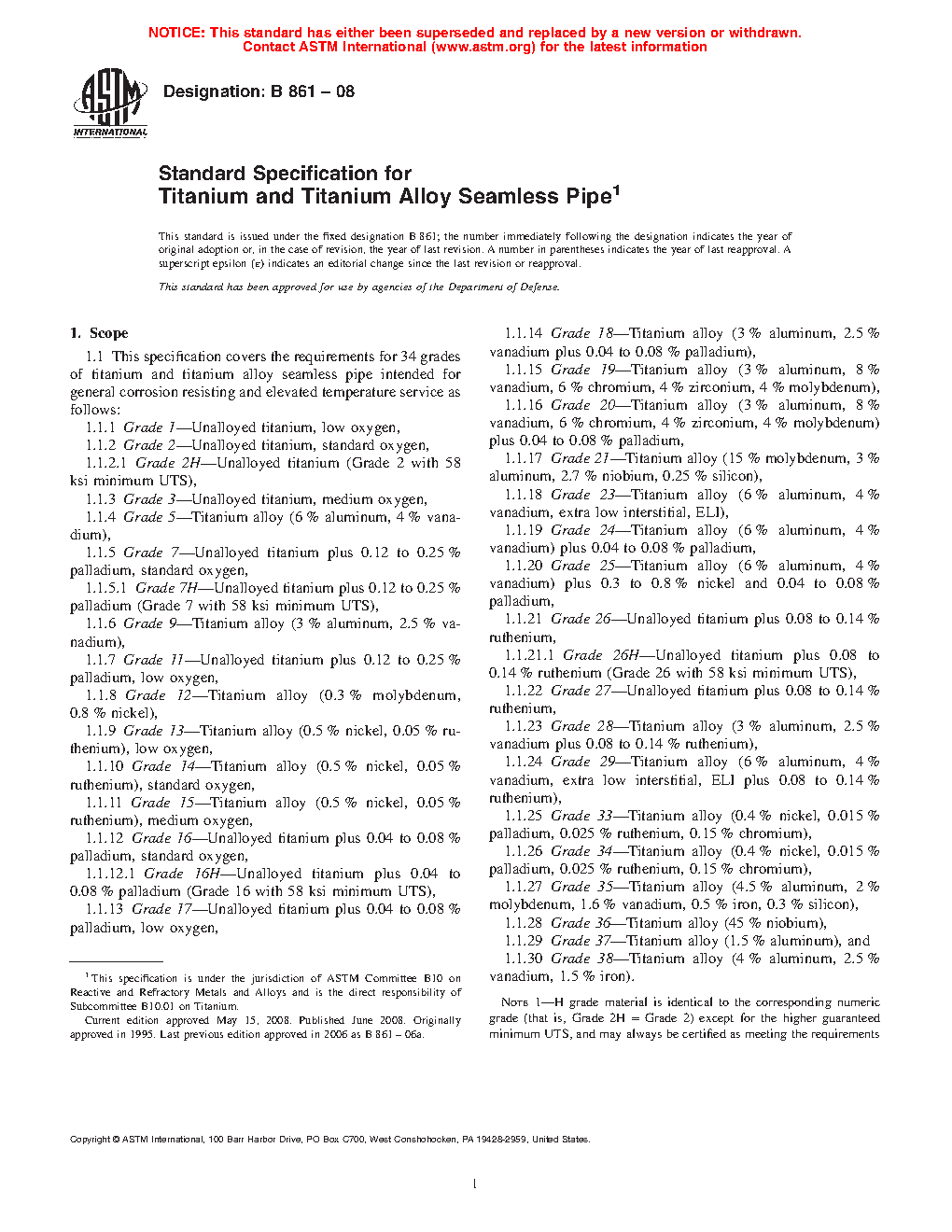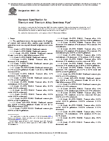 1.1 This specification covers the requirements for 34 grades of titanium and titanium alloy seamless pipe intended for general corrosion resisting and elevated temperature service as follows: