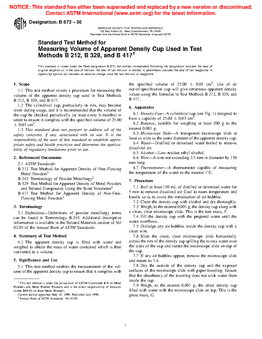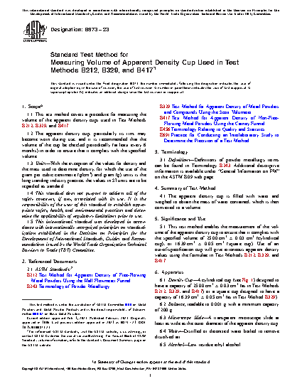 Standard Test Method for Measuring Volume of Apparent Density Cup Used in Test Methods B212, B329, and B417