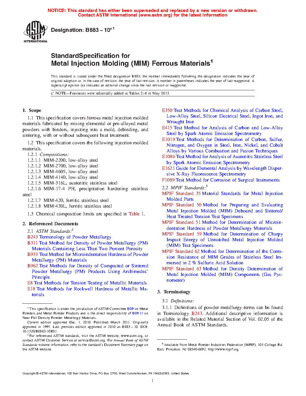 This specification covers ferrous metal injection molded (MIM) materials fabricated by mixing elemental or pre-alloyed metal powders with binders, injecting into a mold, debinding, and sintering with or without subsequent heat treatment. These materials are: low-alloy steel produced from admixtures of iron powder and other alloying elements such as nickel and molybdenum (MIM-2200 and MIM-2700); low-alloy steel produced from admixtures of iron powder and other alloying elements such as nickel, molybdenum, and carbon (MIM-4605); austenitic stainless steel produced from pre-alloyed powder or an admixture of powders (MIM-316L); precipitation hardening stainless steel produced from pre-alloyed powder or an admixture of powders (MIM-17-4 PH); and ferritic stainless steel produced from pre-alloyed powder or an admixture of powders (MIM-430L). Chemical analysis shall be performed for the elements copper, chromium, molybdenum, and nickel. The materials shall be subjected to tensile test and unnotched Charpy impact energy test.