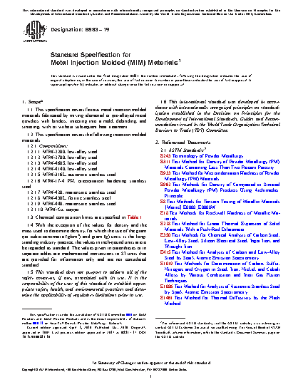 1.1 This specification covers ferrous metal injection molded materials fabricated by mixing elemental or pre-alloyed metal powders with binders, injecting into a mold, debinding, and sintering, with or without subsequent heat treatment.