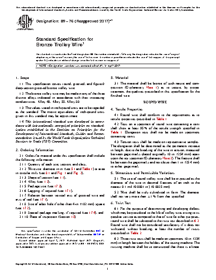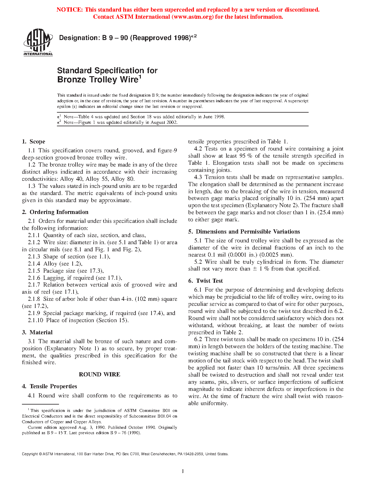 1.1 This specification covers round, grooved, and figure-9 deep-section grooved bronze trolley wire.