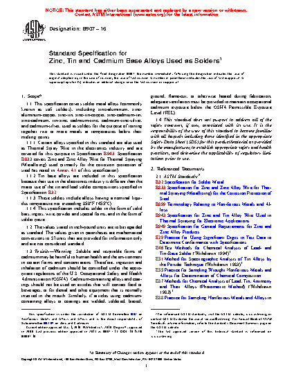 1.1 This specification covers solder metal alloys (commonly known as soft solders), including zinc-aluminum, zinc-aluminum-copper, zinc-tin, zinc-tin-copper, zinc-cadmium-tin, zinc-cadmium, tin-zinc, cadmium-zinc, cadmium-zinc-silver, and cadmium-silver, used as solders for the purpose of joining together two or more metals at temperatures below their melting points.