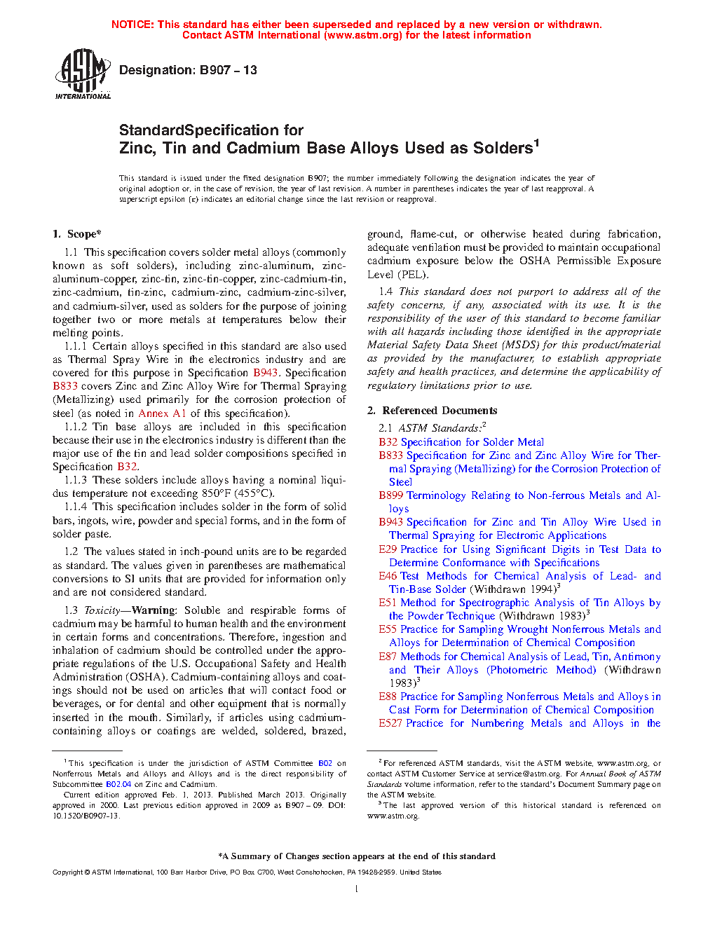 1.3 Toxicity— Warning: Soluble and respirable forms of cadmium may be harmful to human health and the environment in certain forms and concentrations. Therefore, ingestion and inhalation of cadmium should be controlled under the appropriate regulations of the U.S. Occupational Safety and Health Administration (OSHA). Cadmium-containing alloys and coatings should not be used on articles that will contact food or beverages, or for dental and other equipment that is normally inserted in the mouth. Similarly, if articles using cadmium-containing alloys or coatings are welded, soldered, brazed, ground, flame-cut, or otherwise heated during fabrication, adequate ventilation must be provided to maintain occupational cadmium exposure below the OSHA Permissible Exposure Level (PEL).