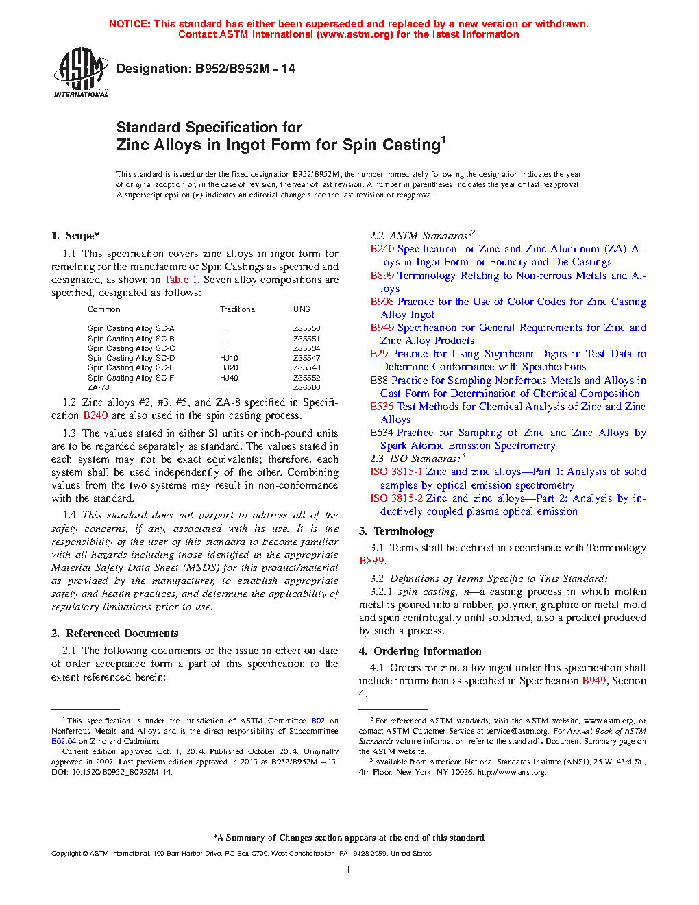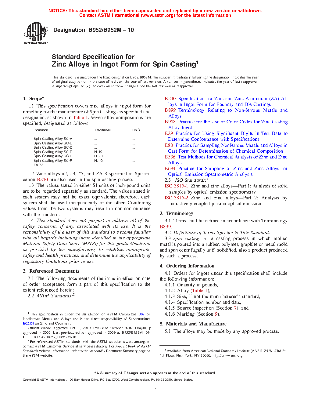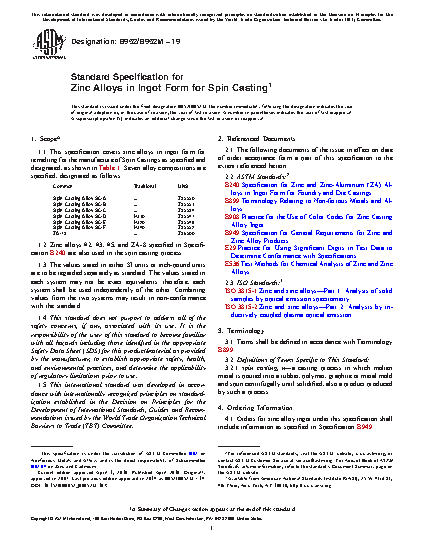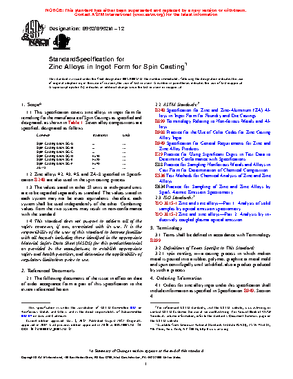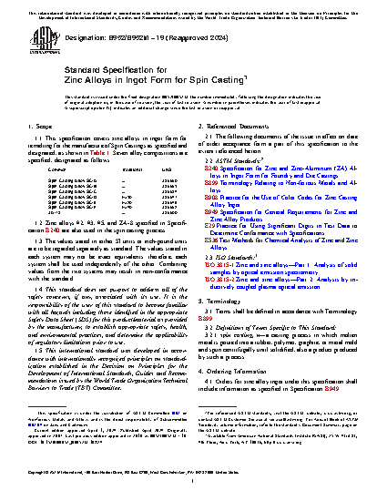 1.1 This specification covers zinc alloys in ingot form for remelting for the manufacture of Spin Castings as specified and designated, as shown in Table 1. Seven alloy compositions are specified, designated as follows: