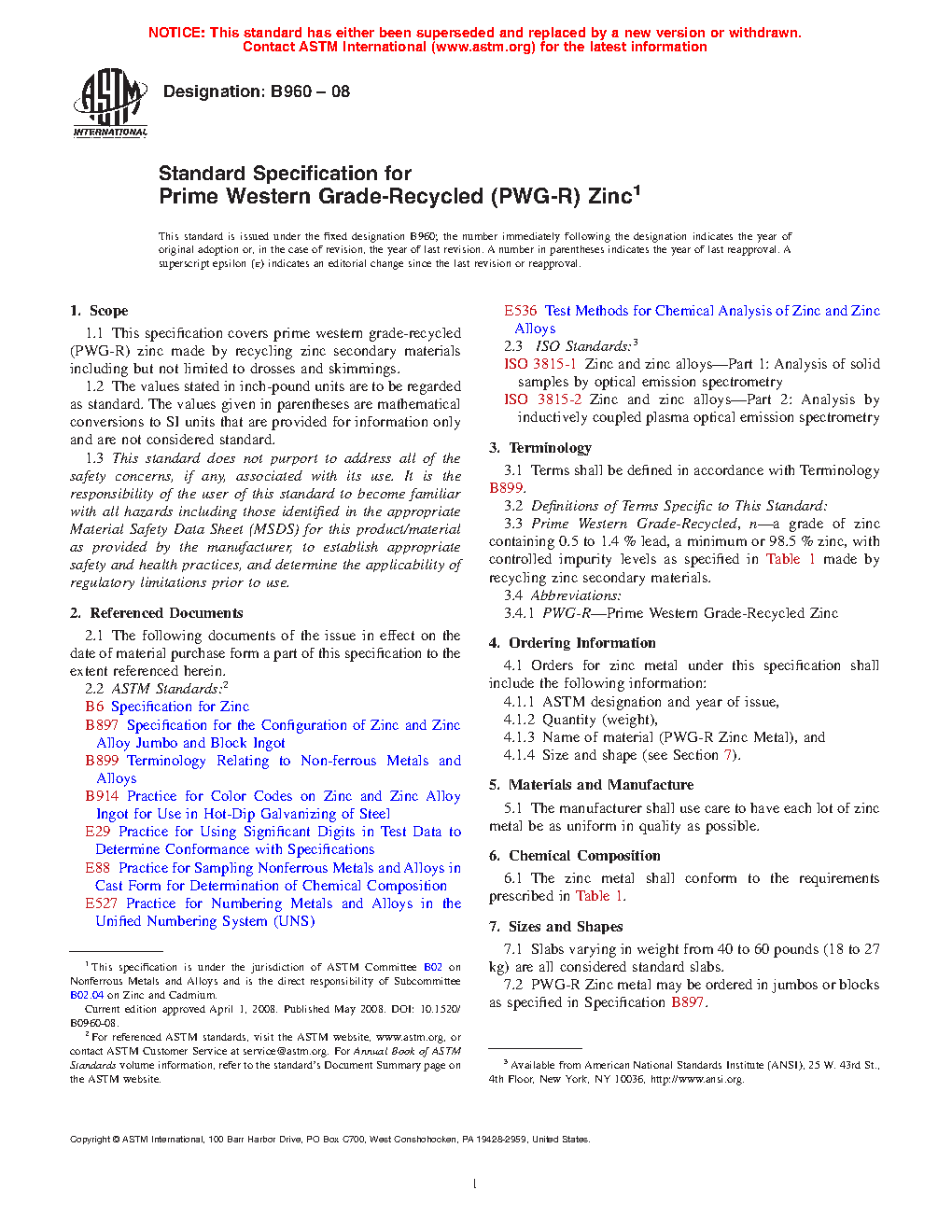1.1 This specification covers prime western grade-recycled (PWG-R) zinc made by recycling zinc secondary materials including but not limited to drosses and skimmings.
