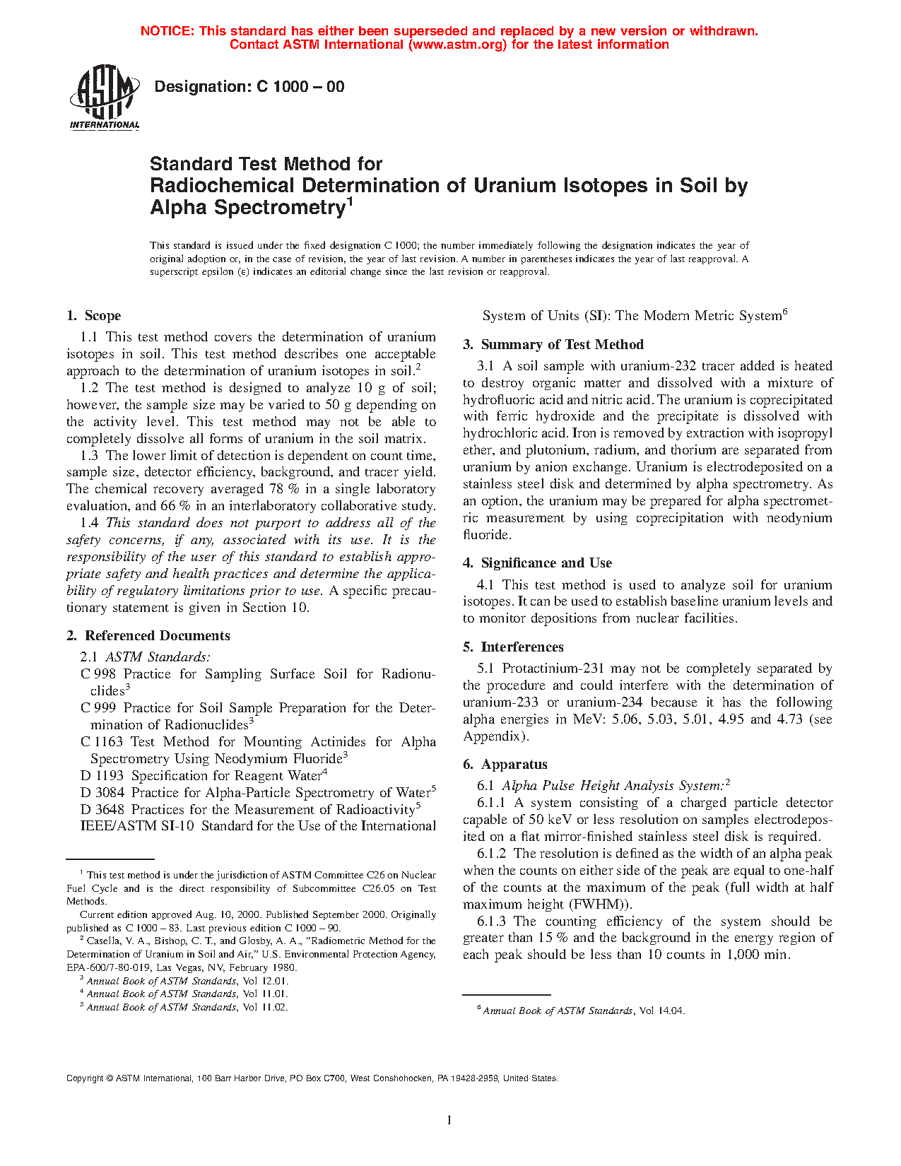 1.1 This test method covers the determination of alpha-emitting uranium isotopes in soil. This test method describes one acceptable approach to the determination of uranium isotopes in soil.