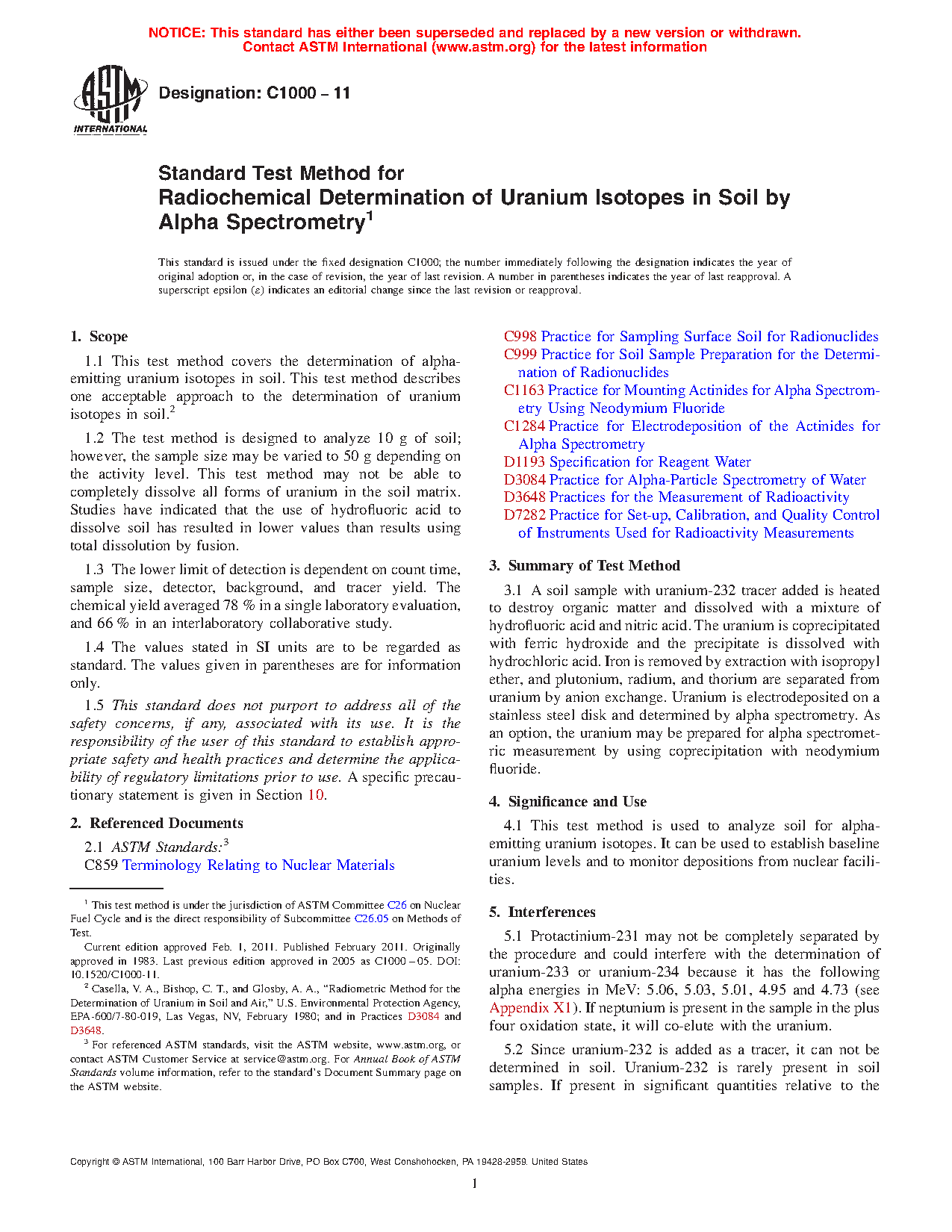 This test method is used to analyze soil for alpha-emitting uranium isotopes. It can be used to establish baseline uranium levels and to monitor depositions from nuclear facilities.