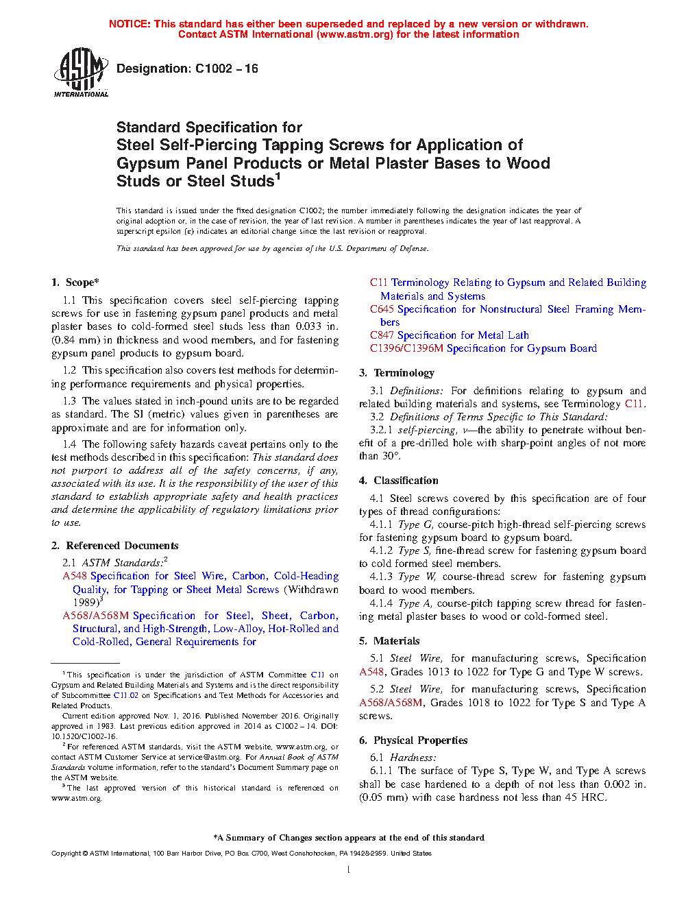 This specification covers steel self-piercing tapping screws for use in fastening gypsum panel products and metal plaster bases to cold-formed steel studs and wood members and for fastening gypsum panel products to gypsum board. Steel screws covered by this specification are of four types of thread configurations: (1) Type G, course-pitch high-thread self-piercing screws for fastening gypsum board to gypsum board; (2) Type S, fine-thread screw for fastening gypsum board to cold formed steel members; (3) Type W, course-thread screw for fastening gypsum board to wood members; and (4) Type A, course-pitch tapping screw thread for fastening metal plaster bases to wood or cold-formed steel. All these steel screw types shall be tested for the determination of performance requirements and physical properties (hardness and ductility) covered in this specification. For the appearance of screws, the form shall be straight and neatly formed, and the threads shall be clean and smooth. Screws shall also have a corrosion-resistant treatment which shall not inhibit adhesion to finishing compounds nor bleed through field-applied decoration.