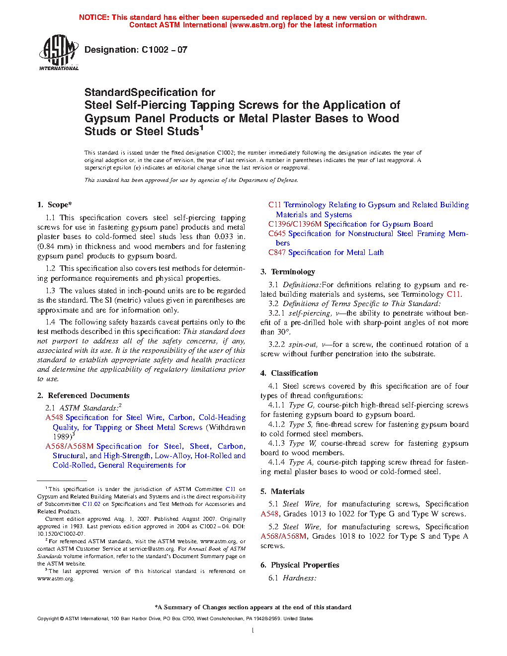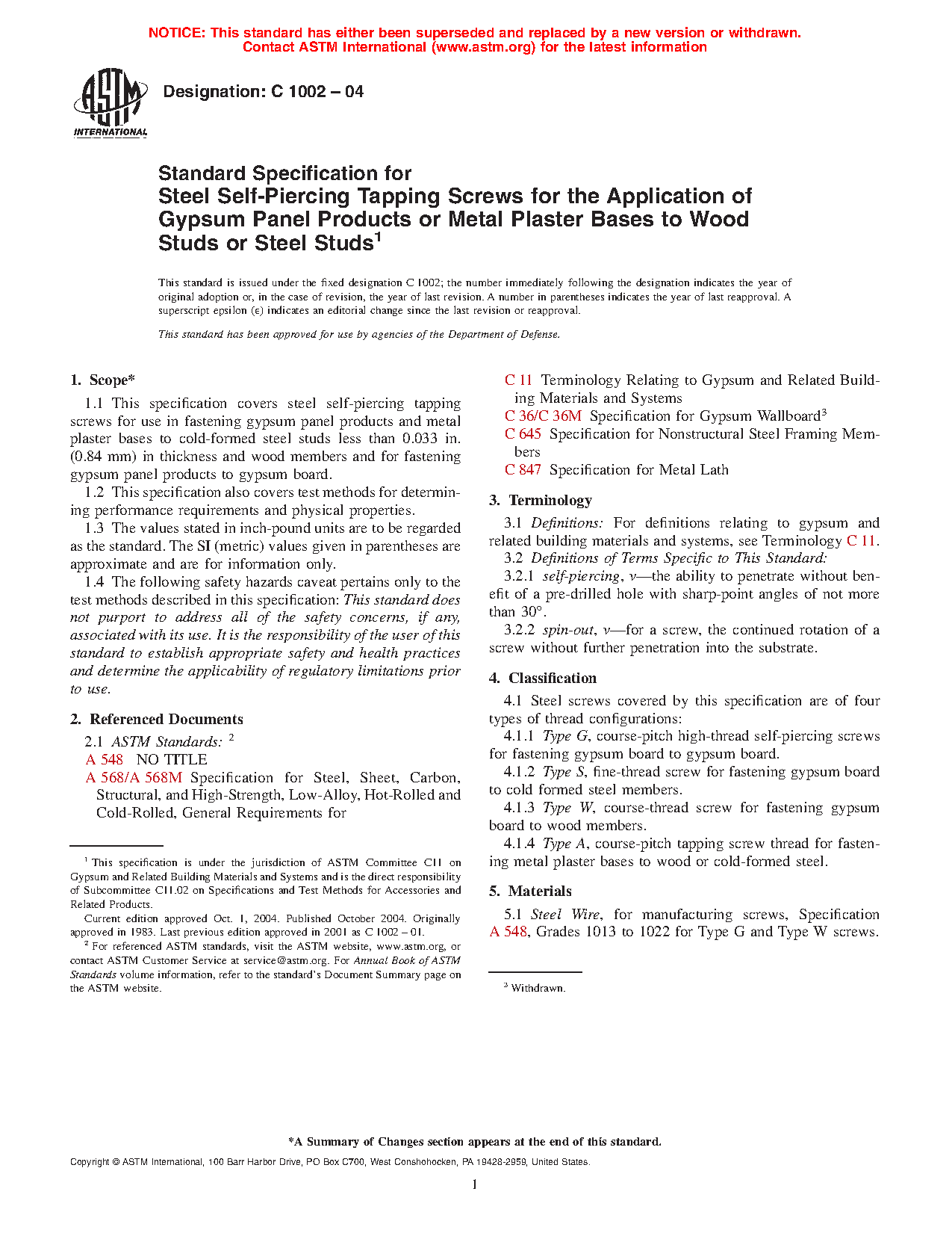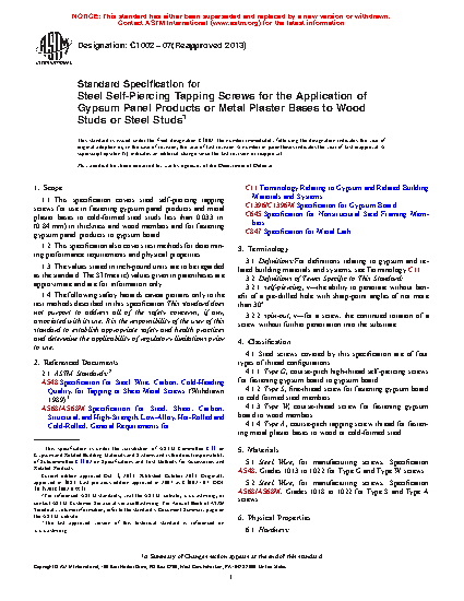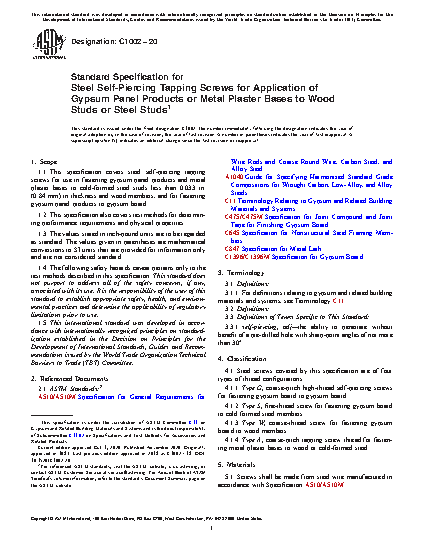 1.1 This specification covers steel self-piercing tapping screws for use in fastening gypsum panel products and metal plaster bases to cold-formed steel studs less than 0.033 in. (0.84 mm) in thickness and wood members and for fastening gypsum panel products to gypsum board.