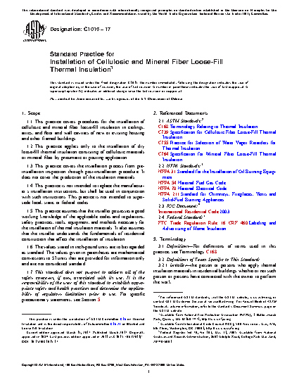 1.1 This practice covers procedures for the installation of cellulosic and mineral fiber loose-fill insulation in ceilings, attics, and floor and wall cavities of new or existing housing and other framed buildings.