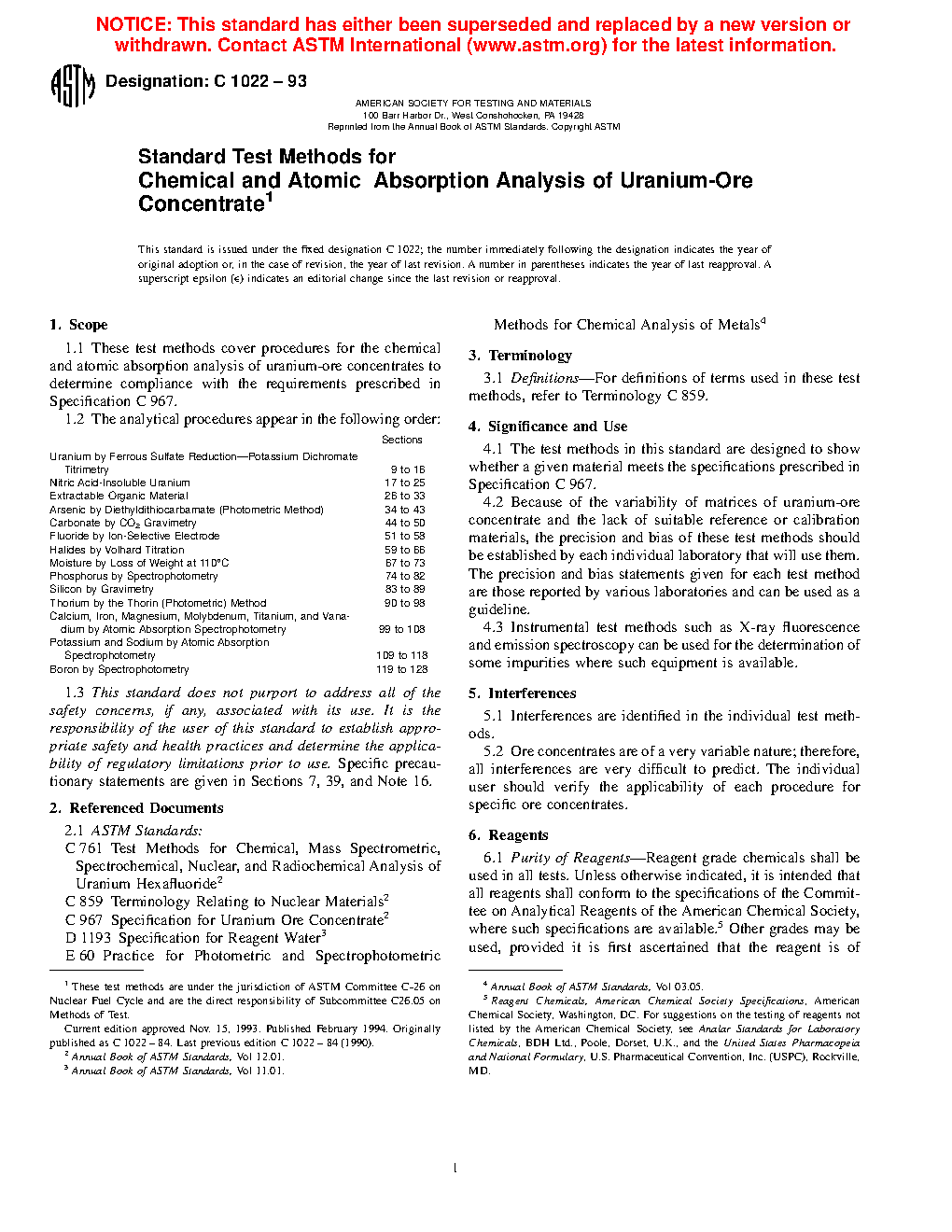 Standard Test Methods for Chemical and Atomic Absorption Analysis of Uranium-Ore Concentrate