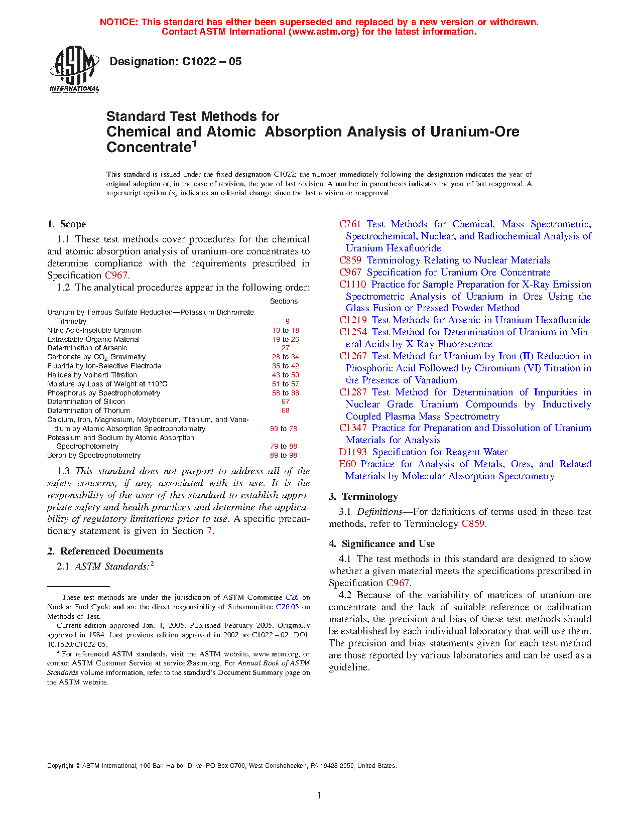 1.1 These test methods cover procedures for the chemical and atomic absorption analysis of uranium-ore concentrates to determine compliance with the requirements prescribed in Specification C 967.