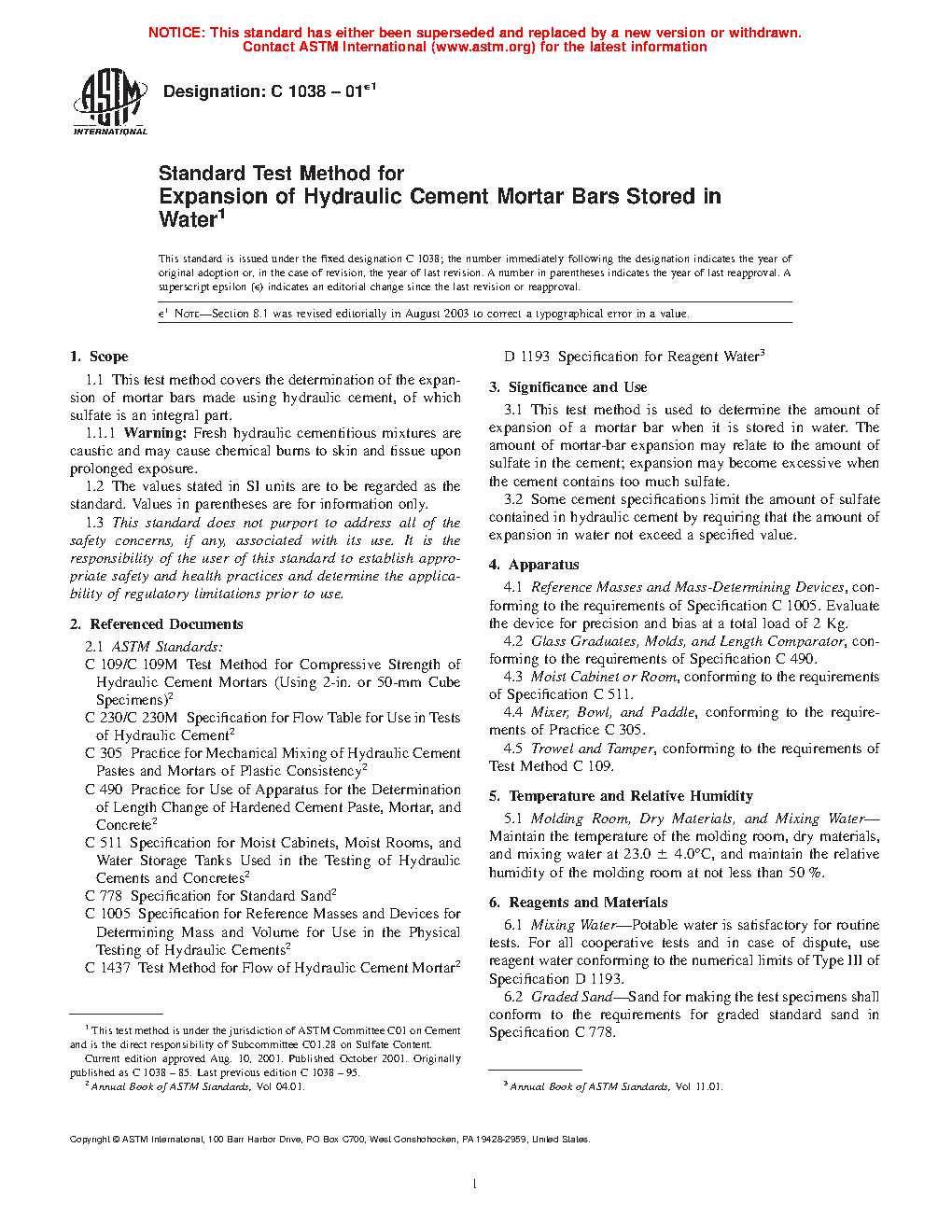 Some cement specifications limit the amount of sulfate contained in hydraulic cement by requiring that the amount of expansion in water not exceed a specified value.