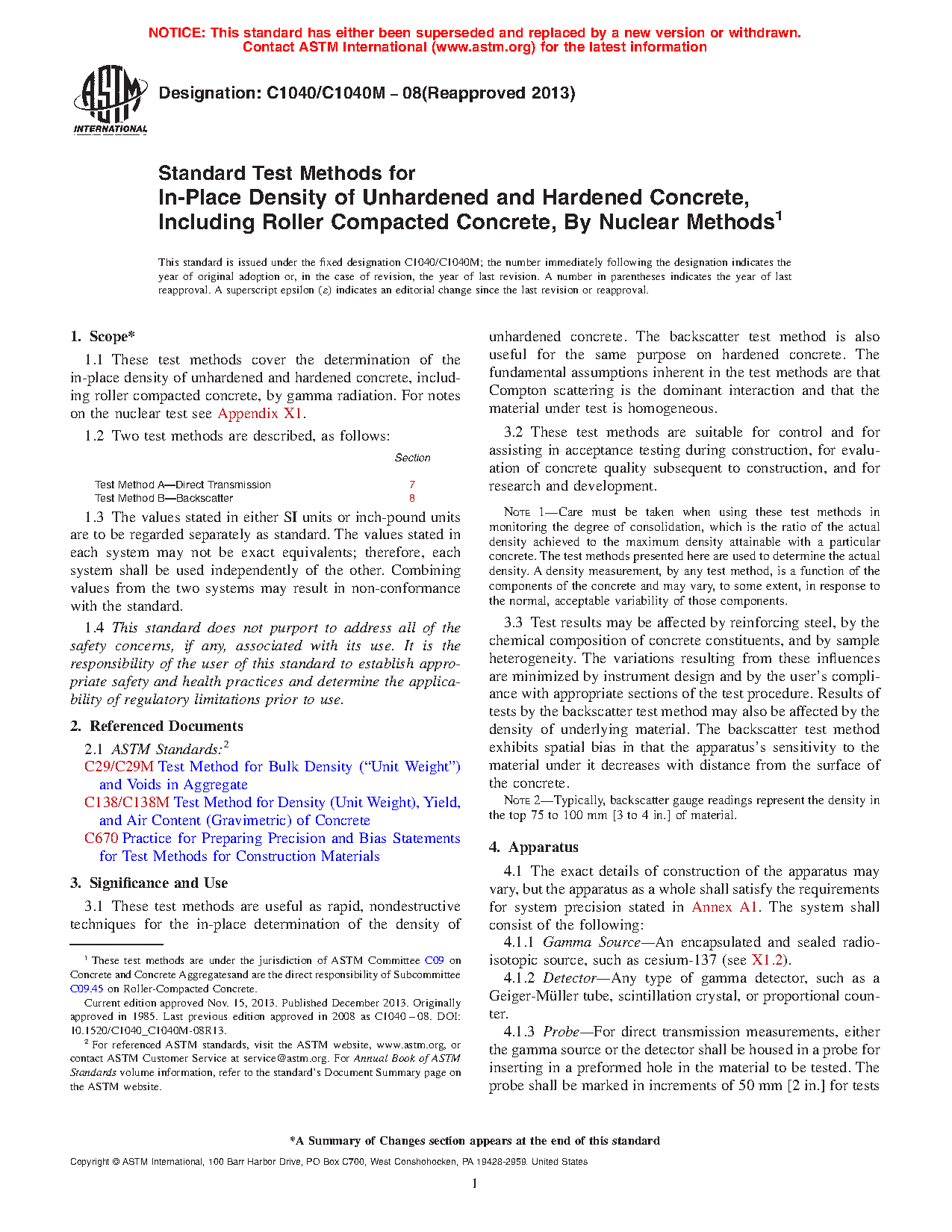 1.1 These test methods cover the determination of the in-place density of unhardened and hardened concrete, including roller compacted concrete, by gamma radiation. For notes on the nuclear test see Appendix X1.