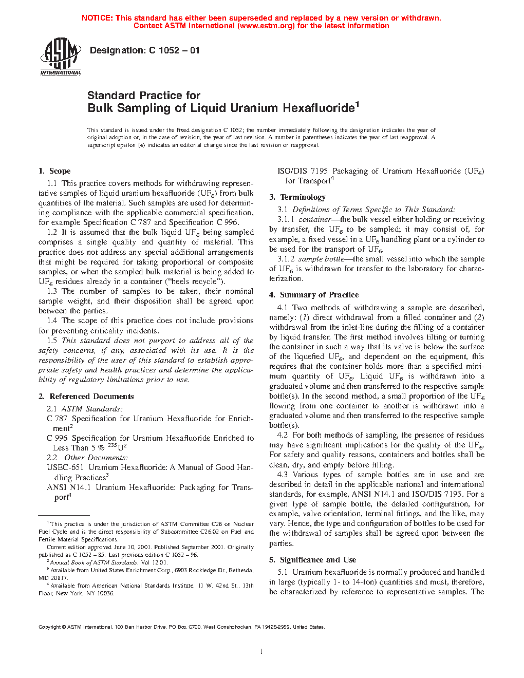 1.2 It is assumed that the bulk liquid UF6 being sampled comprises a single quality and quantity of material. This practice does not address any special additional arrangements that might be required for taking proportional or composite samples. When the sampled bulk material is being added to UF6 residues already in a container (“heels recycle”) additional arrangements are required to avoid cross contamination of the bulk UF6, these are addressed in Specifications C787 and C996.