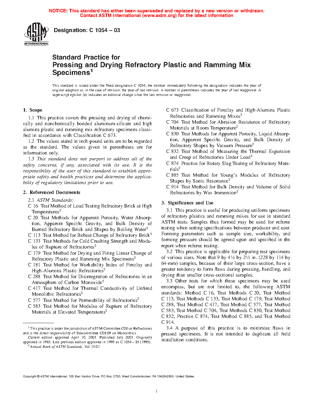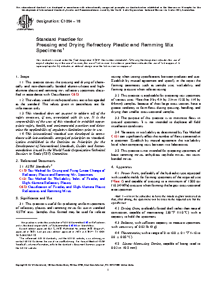 1.1 This practice covers the pressing and drying of chemically and non-chemically bonded alumin-silicate and high-alumina plastic and ramming mix refractory specimens classified in accordance with Classification C673.
