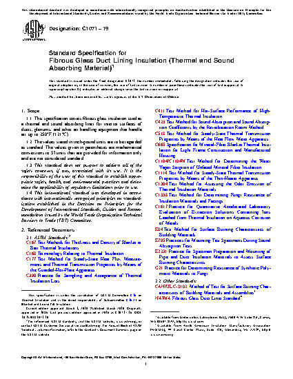 1.1 This specification covers fibrous glass insulation used as a thermal and sound absorbing liner for interior surfaces of ducts, plenums, and other air handling equipment that handle air up to 250°F (121°C).