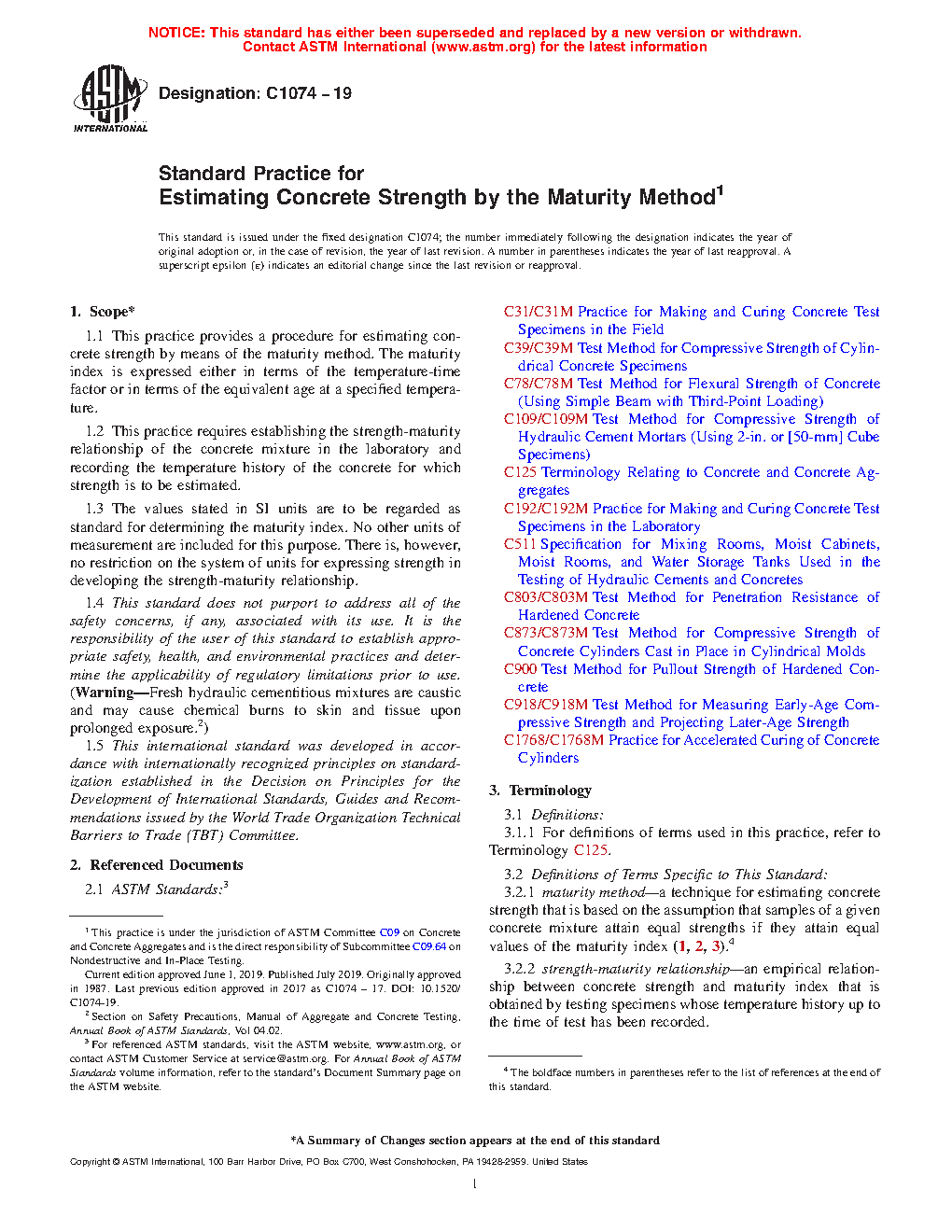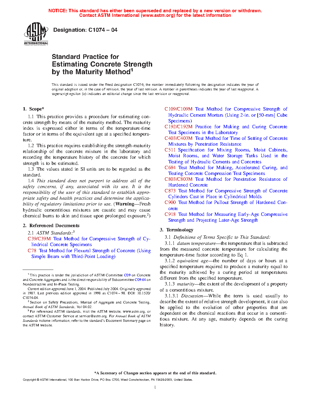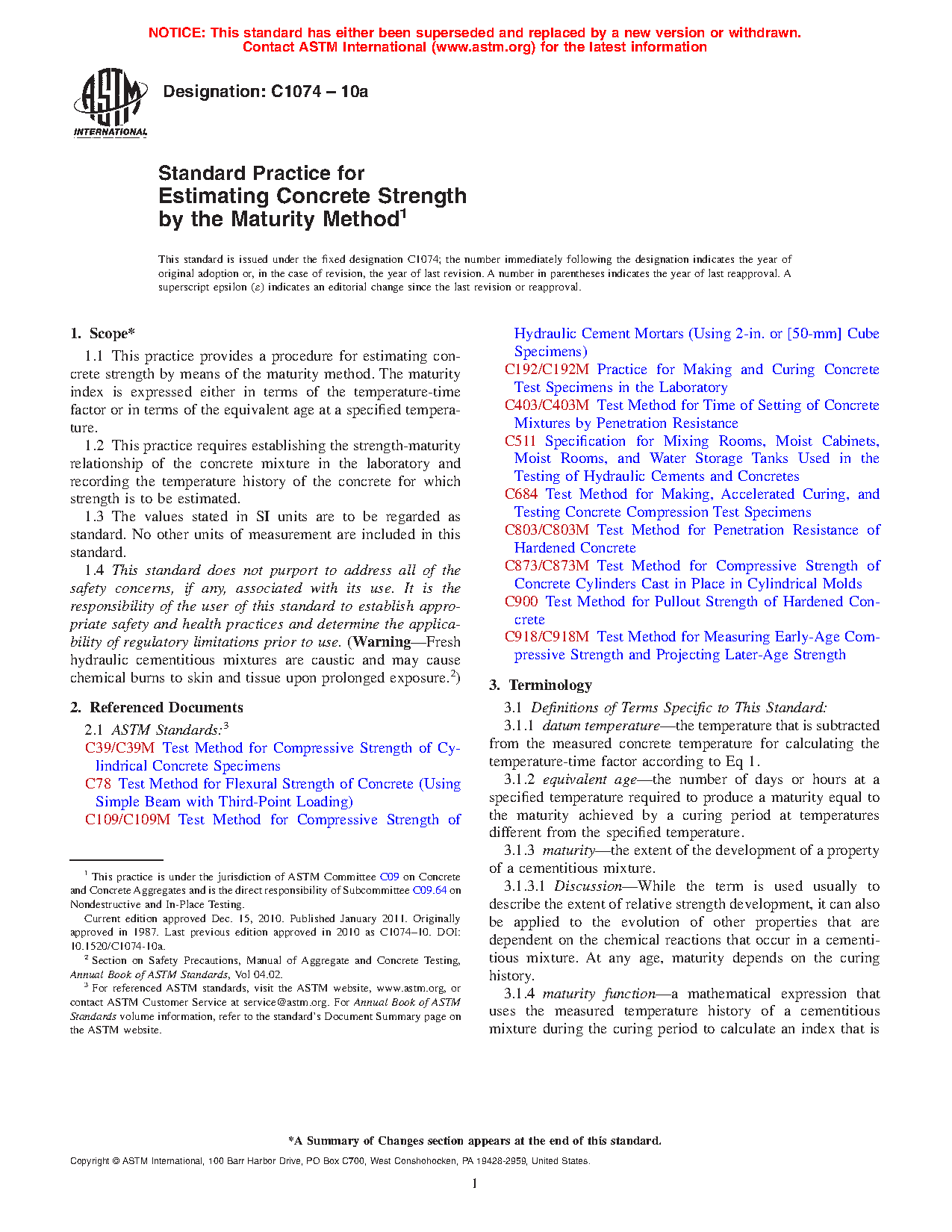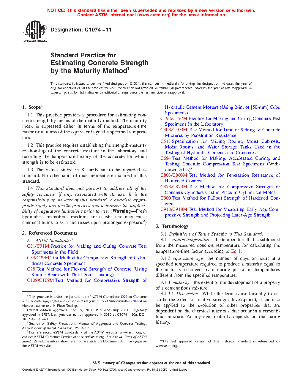 1.1 This practice provides a procedure for estimating concrete strength by means of the maturity method. The maturity index is expressed either in terms of the temperature-time factor or in terms of the equivalent age at a specified temperature.
