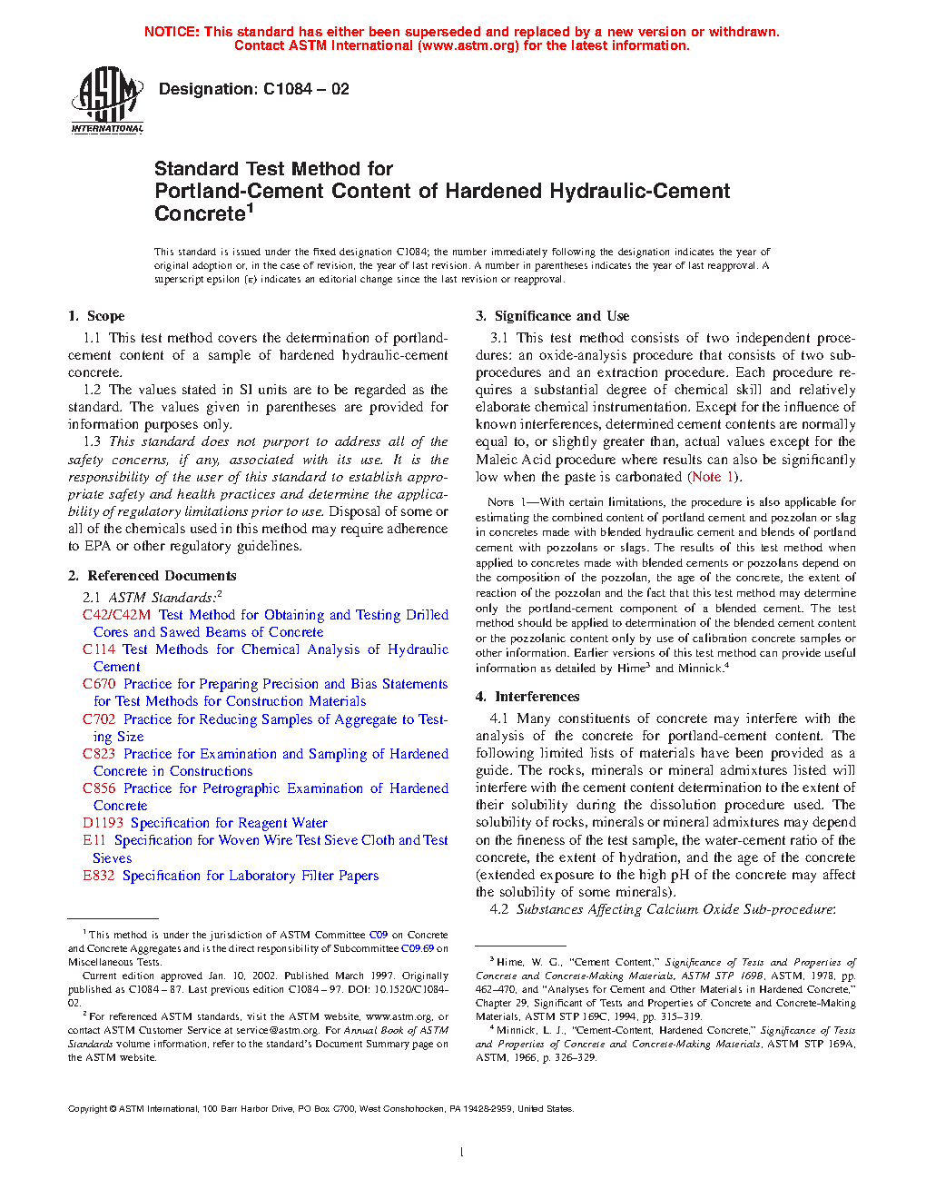 Note 1: With certain limitations, the procedure is also applicable for estimating the combined content of portland cement and pozzolan or slag in concretes made with blended hydraulic cement and blends of portland cement with pozzolans or slags. The results of this test method when applied to concretes made with blended cements or pozzolans depend on the composition of the pozzolan, the age of the concrete, the extent of reaction of the pozzolan and the fact that this test method may determine only the portland-cement component of a blended cement. The test method should be applied to determination of the blended cement content or the pozzolanic content only by use of calibration concrete samples or other information. Earlier versions of this test method can provide useful information as detailed by Hime3 and Minnick.4