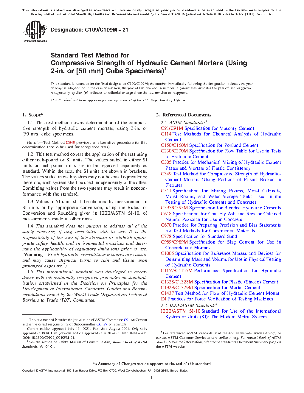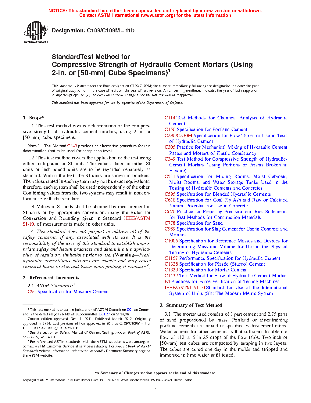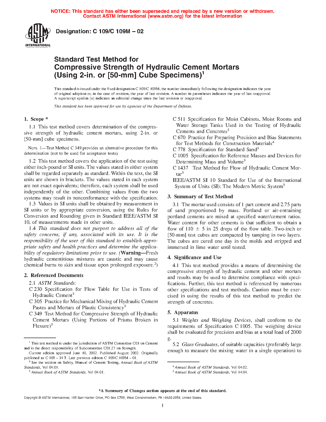1.1 This test method covers determination of the compressive strength of hydraulic cement mortars, using 2-in. or [50-mm] cube specimens.