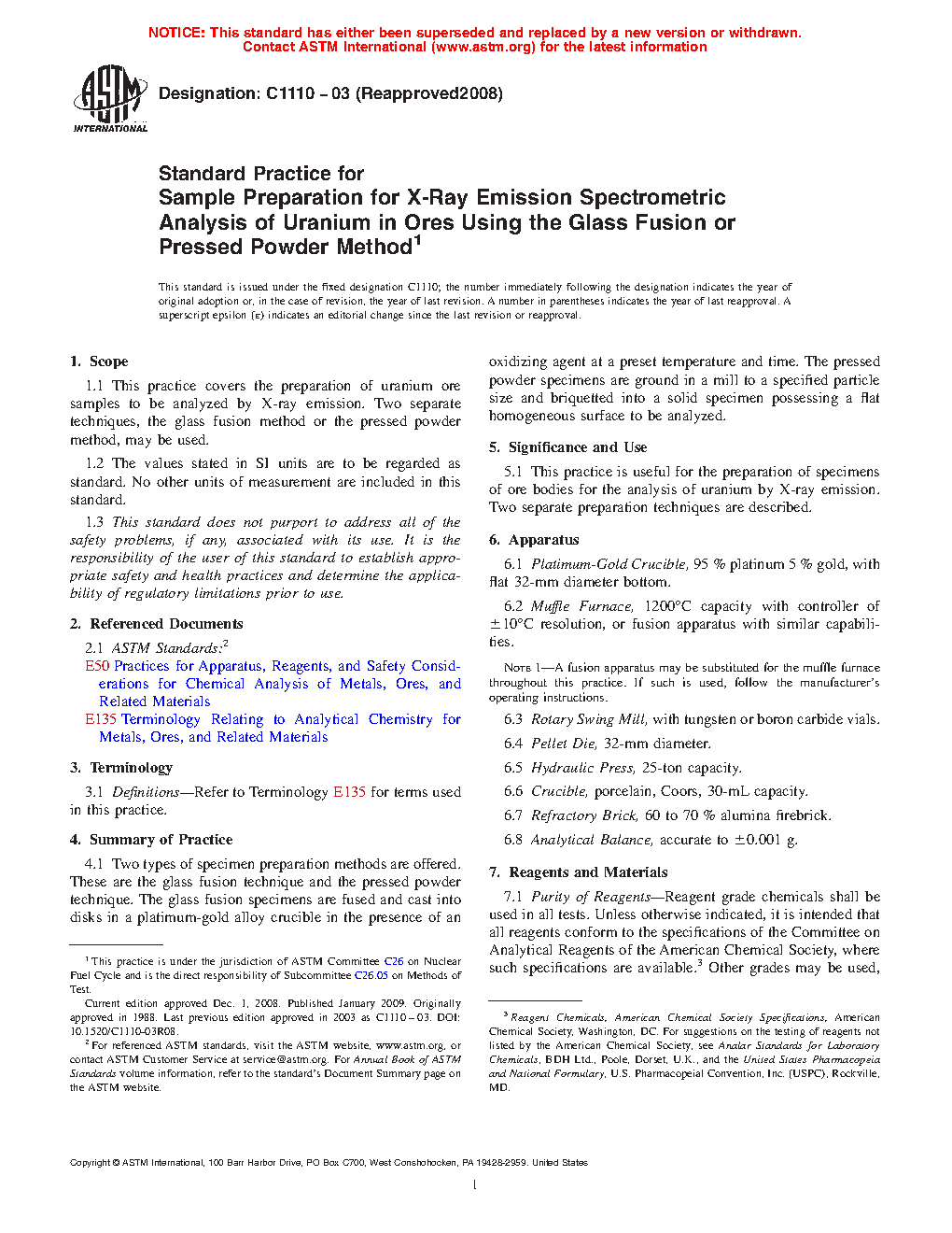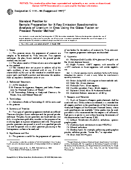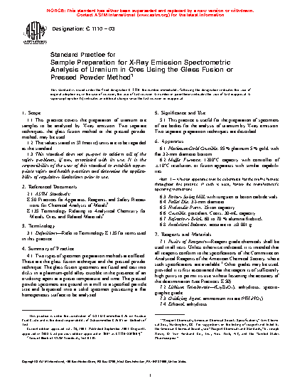 1.1 This practice covers the preparation of uranium ore samples to be analyzed by X-ray emission. Two separate techniques, the glass fusion method or the pressed powder method, may be used.