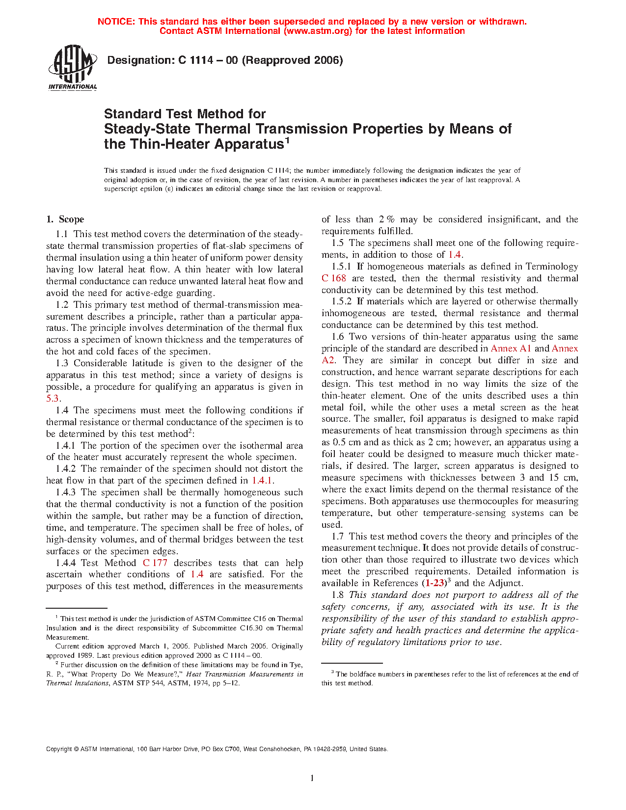1.6 Two versions of thin-heater apparatus using the same principle of the standard are described in Annex A1 and Annex A2. They are similar in concept but differ in size and construction, and hence warrant separate descriptions for each design. This test method in no way limits the size of the thin-heater element. One of the units described uses a thin metal foil, while the other uses a metal screen as the heat source. The smaller, foil apparatus is designed to make rapid measurements of heat transmission through specimens as thin as 0.5 cm and as thick as 2 cm; however, an apparatus using a foil heater could be designed to measure much thicker materials, if desired. The larger, screen apparatus is designed to measure specimens with thicknesses between 3 and 15 cm, where the exact limits depend on the thermal resistance of the specimens. Both apparatuses use thermocouples for measuring temperature, but other temperature-sensing systems can be used.