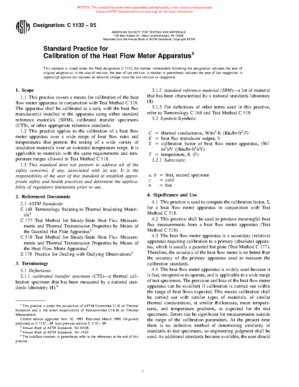 1.1 This practice covers a means for calibration of the heat flow meter apparatus in conjunction with Test Method C518. The apparatus shall be calibrated as a unit, with the heat flux transducer(s) installed in the apparatus using either standard reference materials (SRM), calibrated transfer specimens (CTS), or other appropriate reference standards.