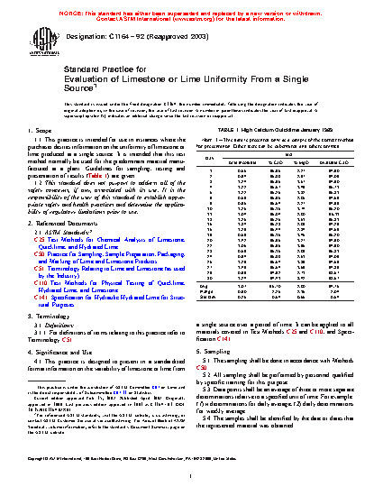 1.1 This practice is intended for use in instances where the purchaser desires information on the uniformity of limestone or lime produced at a single source. It is intended that this test method normally be used for the predominant material manufactured at a plant. Guidelines for sampling, testing and presentation of results (Table 1) are given.