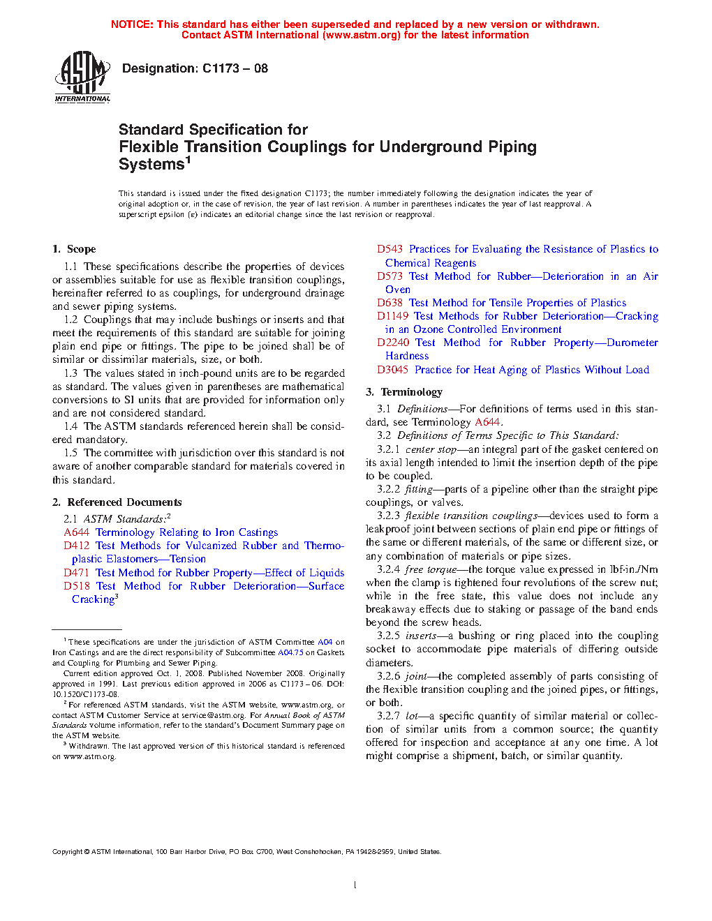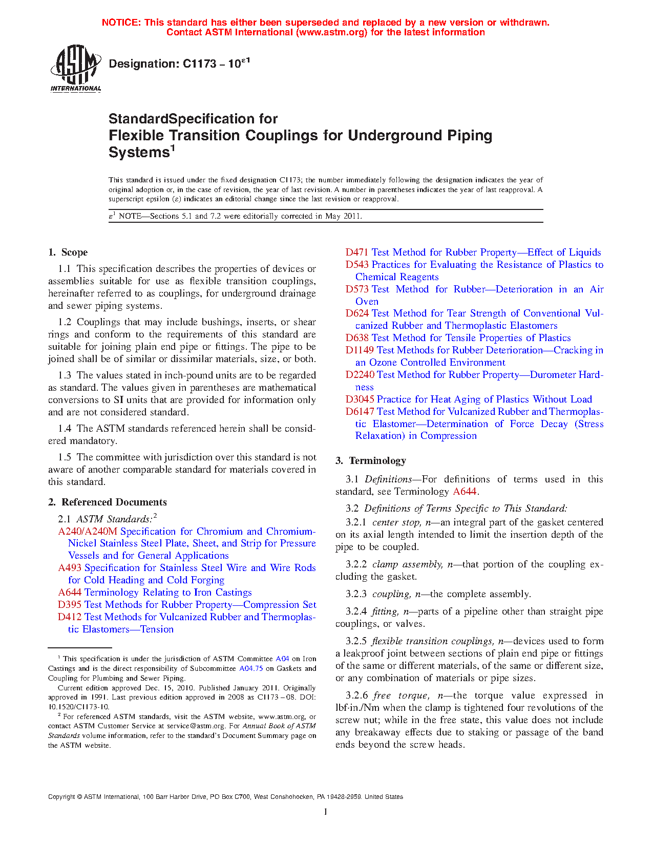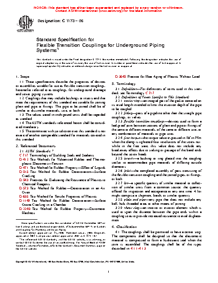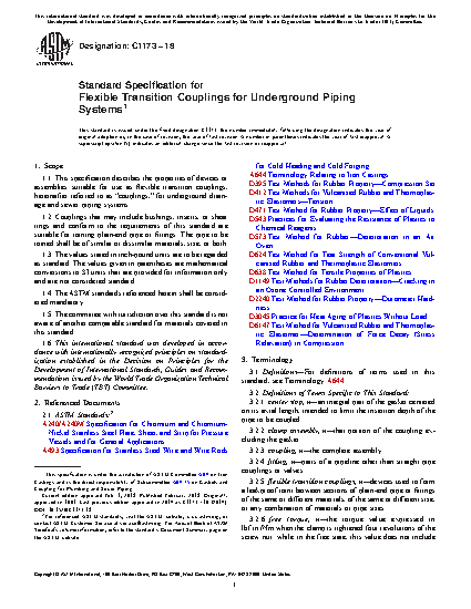 1.1 This specification describes the properties of devices or assemblies suitable for use as flexible transition couplings, hereinafter referred to as “couplings,” for underground drainage and sewer piping systems.