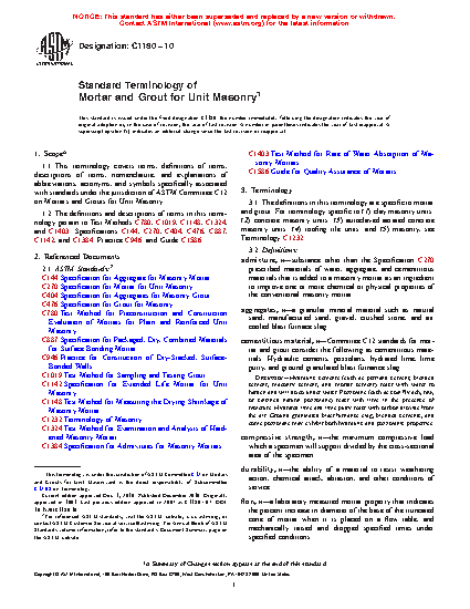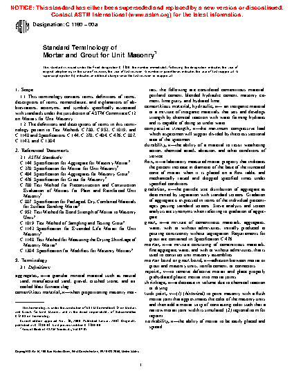 1.2 The definitions and descriptions of terms in this terminology pertain to Test Methods C780, C1019, C1148, C1324, and C1403; Specifications C144, C270, C404, C476, C887, and C1384; Practice C946; and Guide C1586.