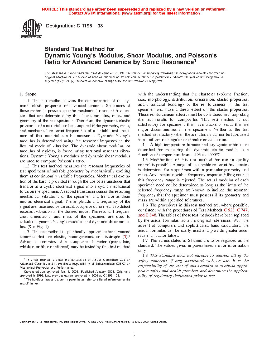 1.2 This test method is specifically appropriate for advanced ceramics that are elastic, homogeneous, and isotropic (1). Advanced ceramics of a composite character (particulate, whisker, or fiber reinforced) may be tested by this test method with the understanding that the character (volume fraction, size, morphology, distribution, orientation, elastic properties, and interfacial bonding) of the reinforcement in the test specimen will have a direct effect on the elastic properties. These reinforcement effects must be considered in interpreting the test results for composites. This test method is not satisfactory for specimens that have cracks or voids that are major discontinuities in the specimen. Neither is the test method satisfactory when these materials cannot be fabricated in a uniform rectangular or circular cross section.