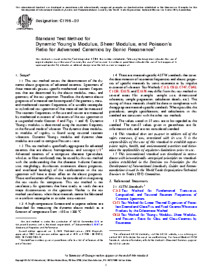 1.1 This test method covers the determination of the dynamic elastic properties of advanced ceramics. Specimens of these materials possess specific mechanical resonant frequencies that are determined by the elastic modulus, mass, and geometry of the test specimen. Therefore, the dynamic elastic properties of a material can be computed if the geometry, mass, and mechanical resonant frequencies of a suitable test specimen of that material can be measured. Dynamic Young's modulus is determined using the resonant frequency in the flexural mode of vibration. The dynamic shear modulus, or modulus of rigidity, is found using torsional resonant vibrations. Dynamic Young's modulus and dynamic shear modulus are used to compute Poisson's ratio.