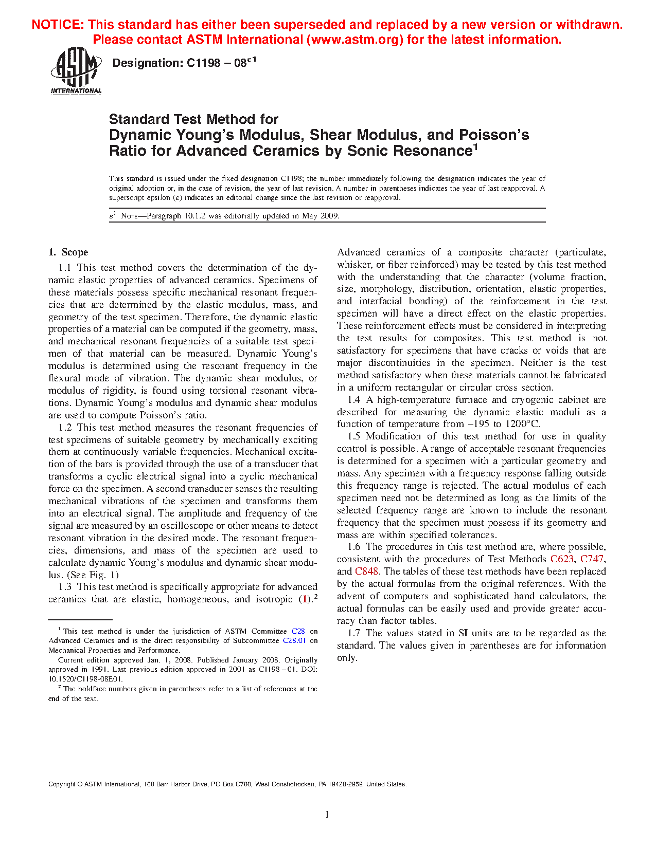1.5 The procedures in this test method are, where possible, consistent with the procedures of Test Methods C623, C747, and C848. The tables of these test methods have been replaced by the actual formulas from the original references. With the advent of computers and sophisticated hand calculators, the actual formulas can be easily used and provide greater accuracy than factor tables.