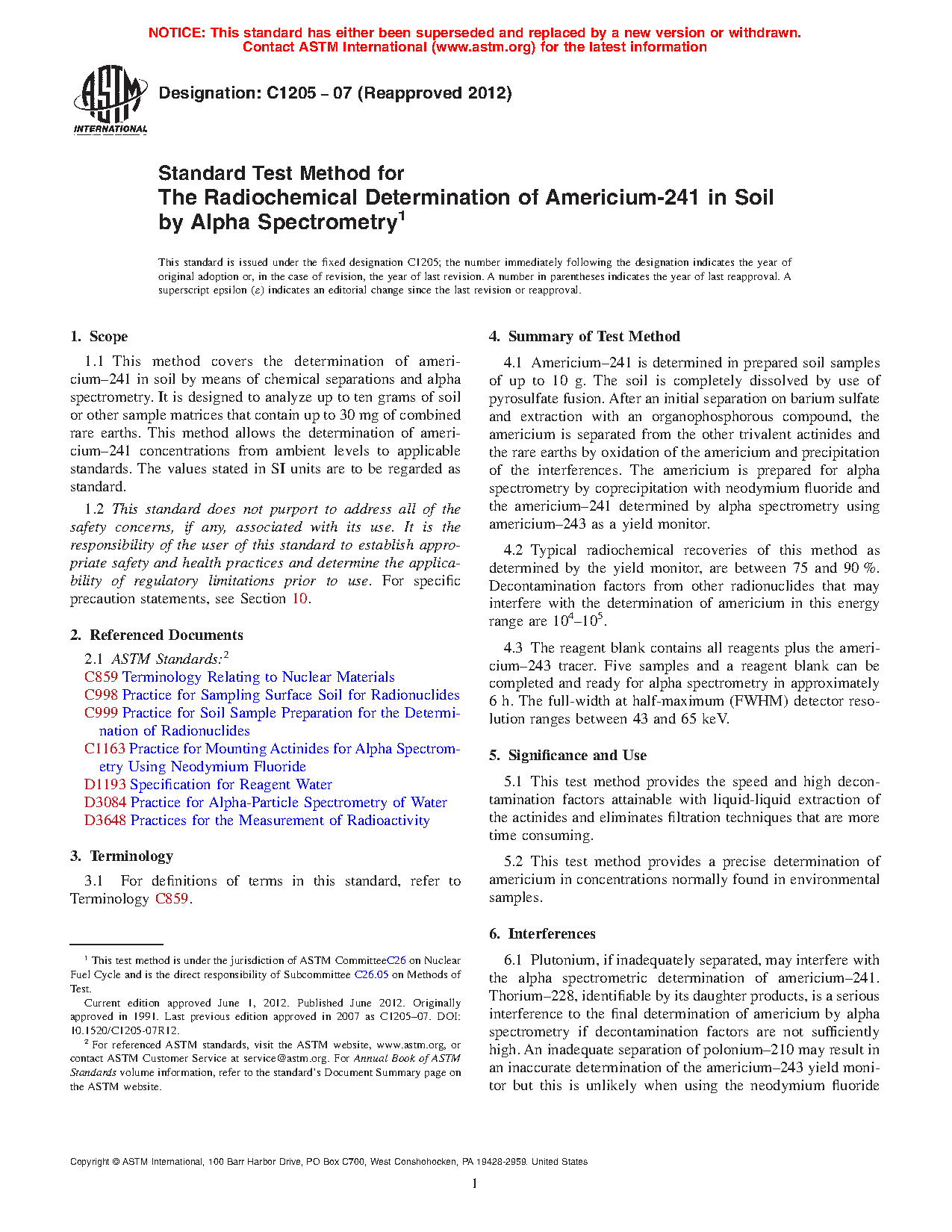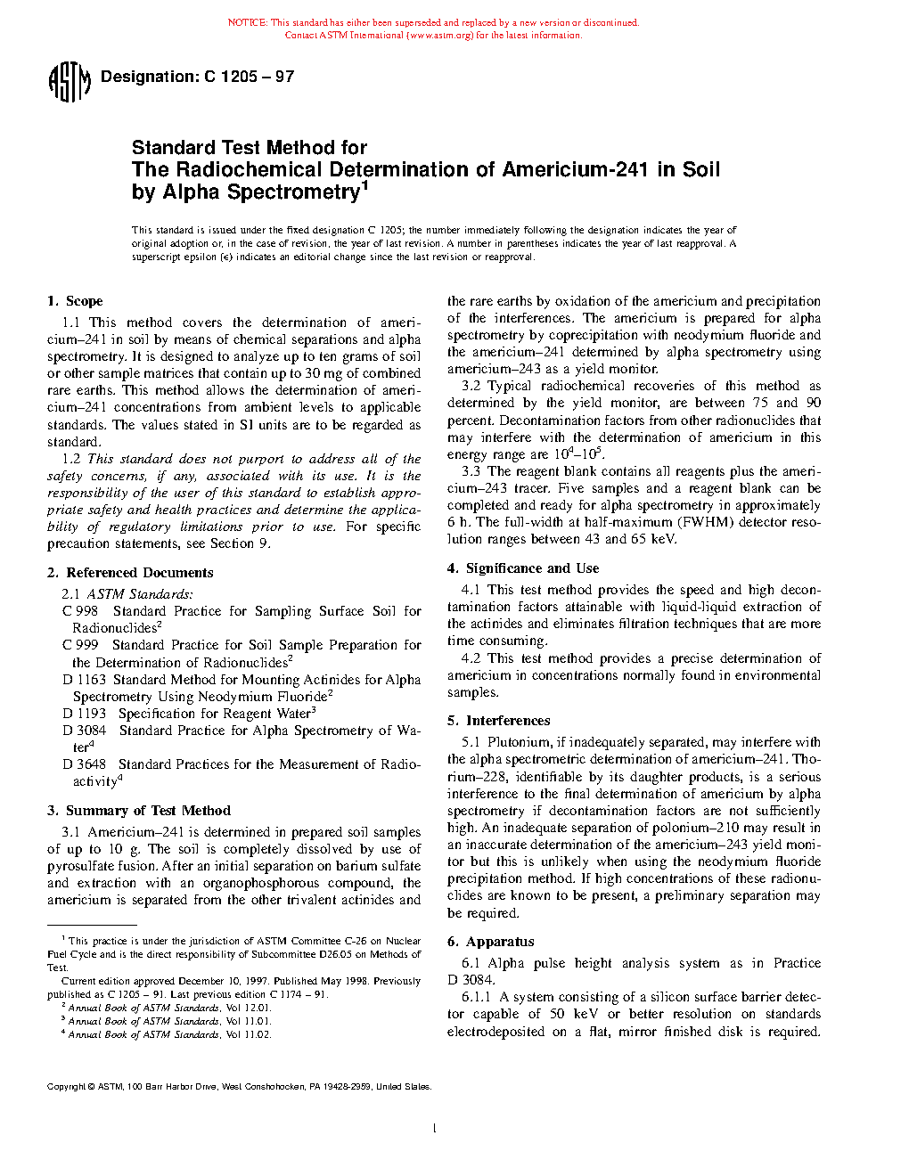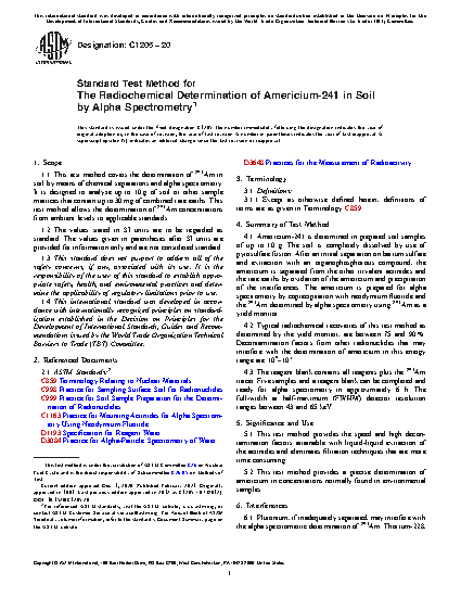 1.1 This method covers the determination of americium-241 in soil by means of chemical separations and alpha spectrometry. It is designed to analyze up to ten grams of soil or other sample matrices that contain up to 30 mg of combined rare earths. This method allows the determination of americium-241 concentrations from ambient levels to applicable standards. The values stated in SI units are to be regarded as standard.