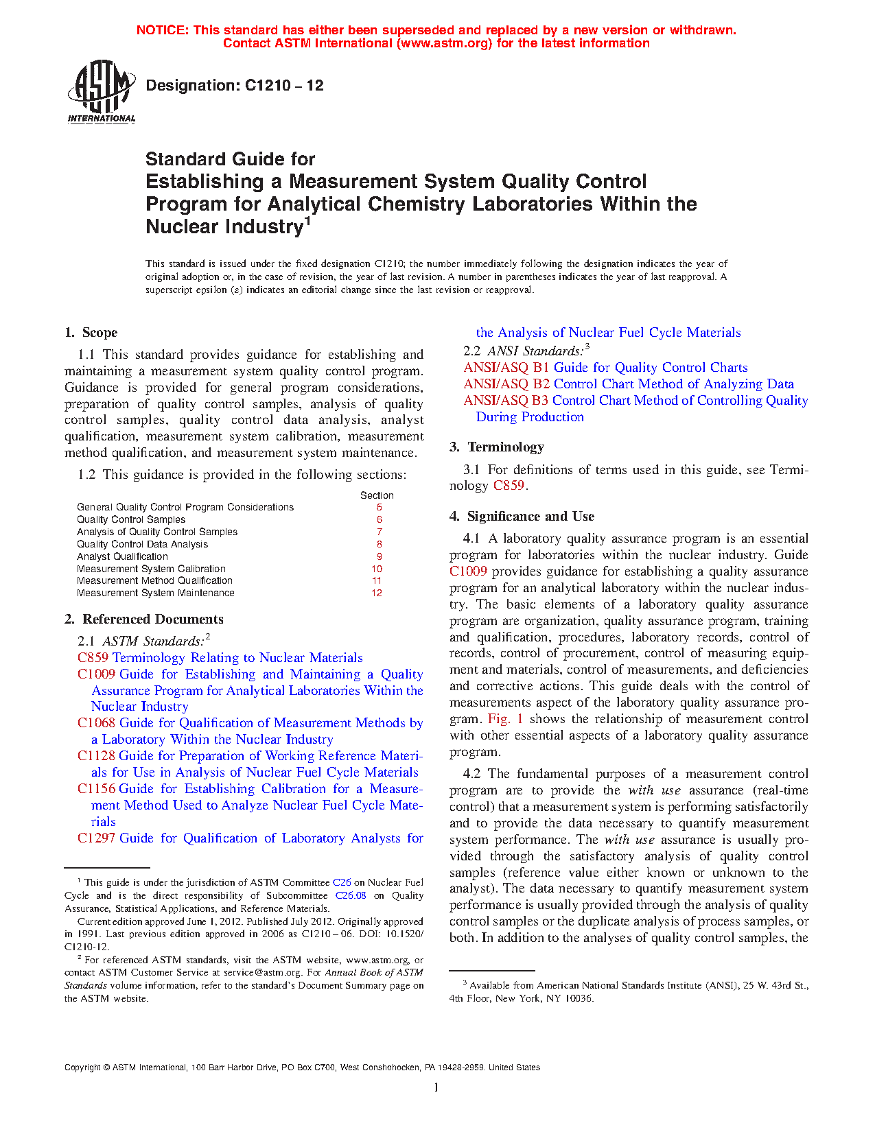 The fundamental purposes of a measurement control program are to provide the with use assurance (real-time control) that a measurement system is performing satisfactorily and to provide the data necessary to quantify measurement system performance. The with use assurance is usually provided through the satisfactory analysis of quality control samples (reference value either known or unknown to the analyst). The data necessary to quantify measurement system performance is usually provided through the analysis of quality control samples or the duplicate analysis of process samples, or both. In addition to the analyses of quality control samples, the laboratory quality control program should address (1) the preparation and verification of standards and reagents, (2) data analysis procedures and documentation, (3) calibration and calibration procedures, (4) measurement method qualification, (5) analyst qualification, and (6) other general program considerations. Other elements of laboratory quality assurance also impact the laboratory quality control program. These elements or requirements include (1) chemical analysis procedures and procedure control, (2) records storage and retrieval requirements, (3) internal audit requirements, (4) organizational considerations, and (5) training/qualification requirements. To the extent possible, this standard will deal primarily with quality control requirements rather than overall quality assurance requirements.
