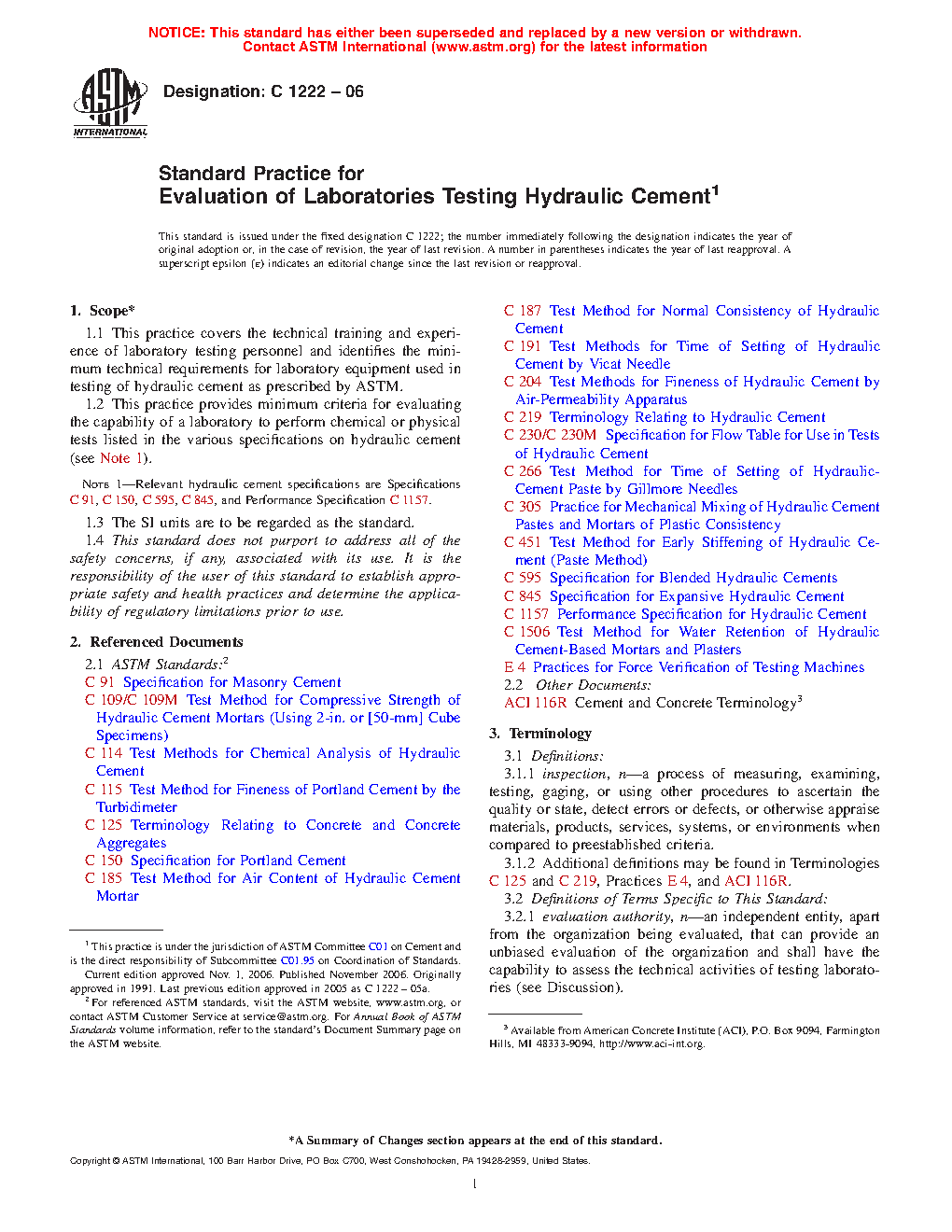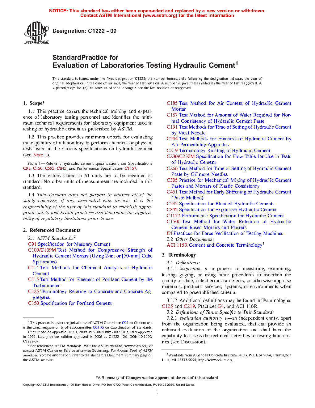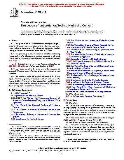 1.2 This practice provides minimum criteria for evaluating the capability of a laboratory to perform chemical or physical tests listed in the various specifications on hydraulic cement (see Note 1).