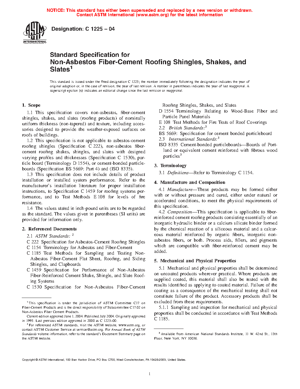 1.3 This specification does not include details of product installation or installed system performance. Refer to the manufacturer's installation literature for proper installation instructions, to Specification C1459 for roofing systems performance, and to Test Methods E108 for levels of fire resistance.